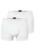 schwarze Herrenshorts im praktischen Doppelpack, aus der SCHIESSER Serie 'Cotton Flex', formstabil, superweich & dehnbar durch unterschiedliche Stricktechnik, moderne, nahtlose Passform ohne störende Seitennähte / Webgummi mit platzierten SCHIESSER-Schriftzug, hochwertiges Material sorgt für schnellen Feuchtigkeitstransport & Haltbarkeit, unsere Models tragen Größe 50/M, in perfekt sitzender, elastischer Single-Jersey-Qualität