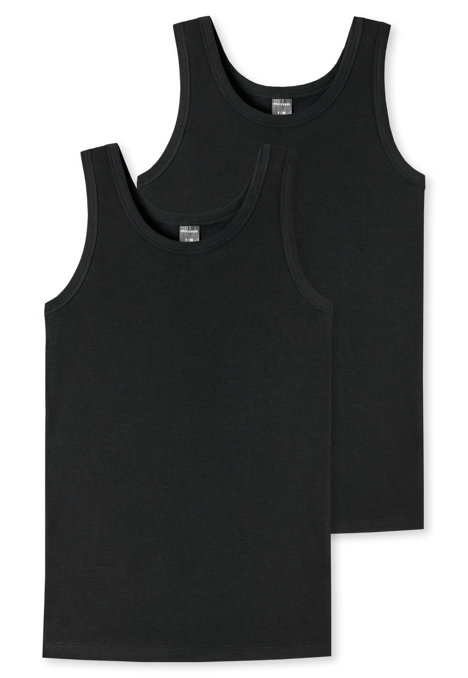 Tank Tops für Jungen in Weiß, aus der beliebten SCHIESSER-Serie '95/5', im praktischen Doppelpack, runder Halsausschnitt, Arm- und Halsausschnitt mit Einfass, breite Träger für hohen Tragekomfort, in elastischer, hochwertiger Single-Jersey-Qualität aus Organic Cotton