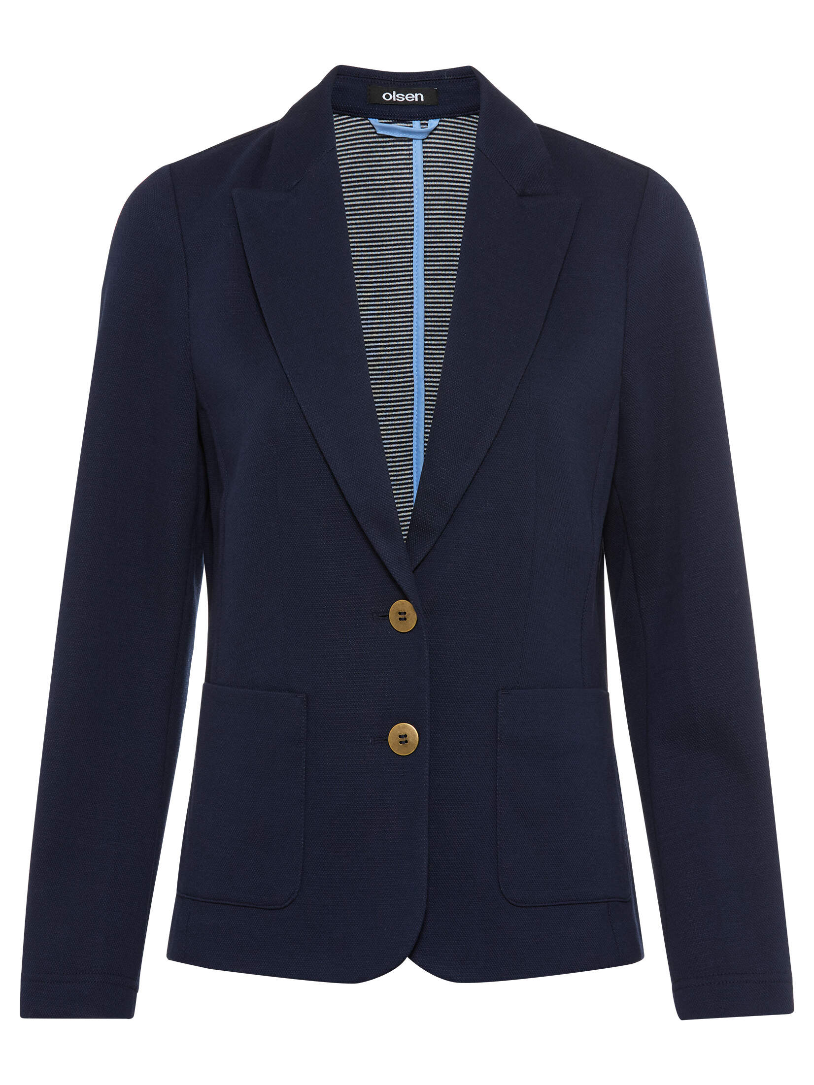 Moderner Jersey-Blazer mit sportivem Touch. Der Blazer überzeugt mit zwei Knöpfen, aufgesetzten Taschen und kleinen Zierknöpfen an den Ärmeln. Dank des soften Polyester-Baumwoll-Mix trägt er sich besonders angenehm und bietet einen gepflegten Look mit bequemem Tragegefühl. Vielseitig kombinierbar – ob lässig zu Jeans oder elegant zur Stoffhose. Futter aus 100% Polyester. Länge ca. 60 cm.