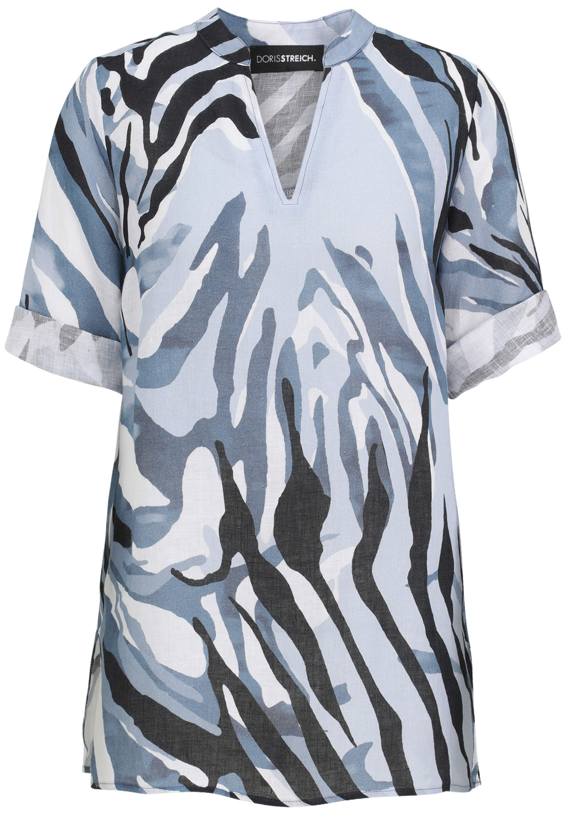 Die lässige Bluse von Doris Streich ist aus softem Leinen gefertigt. Der dekorativ verfremdete Animalprint macht diese Bluse zum Hingucker: Die Ärmel der 3/4-Arm Bluse können hochgekrempelt werden. Die Rückenpasse mit tiefer Falte und die Seitenschlitze