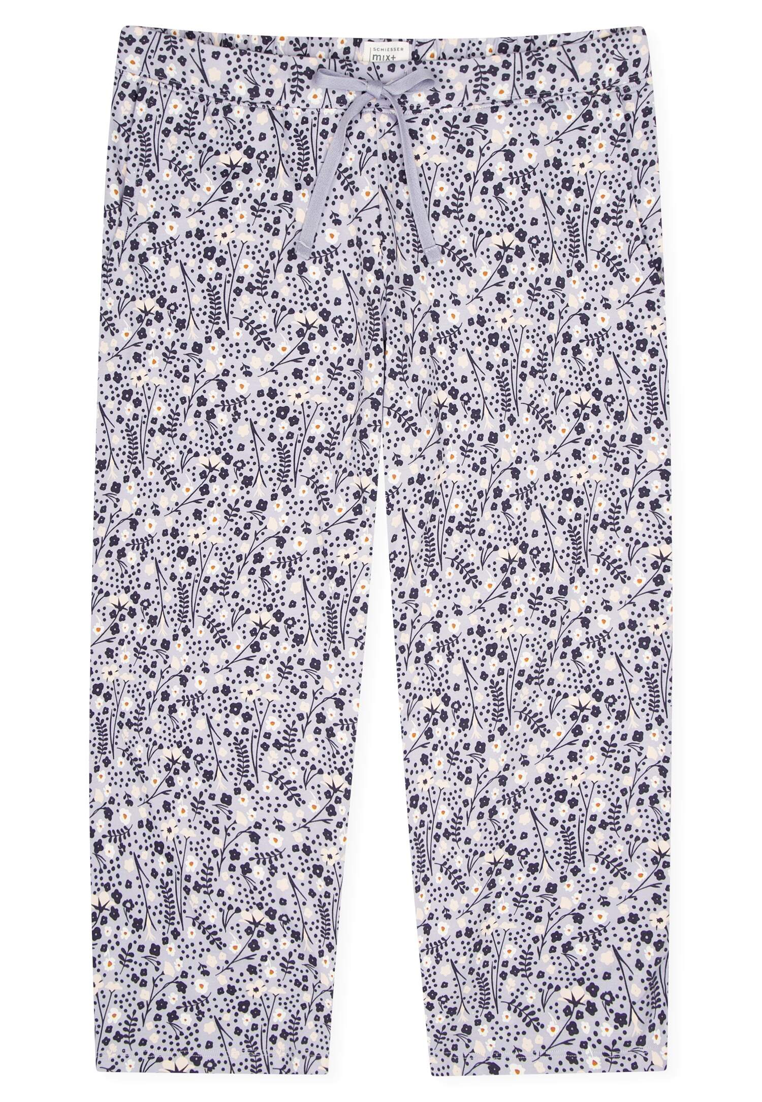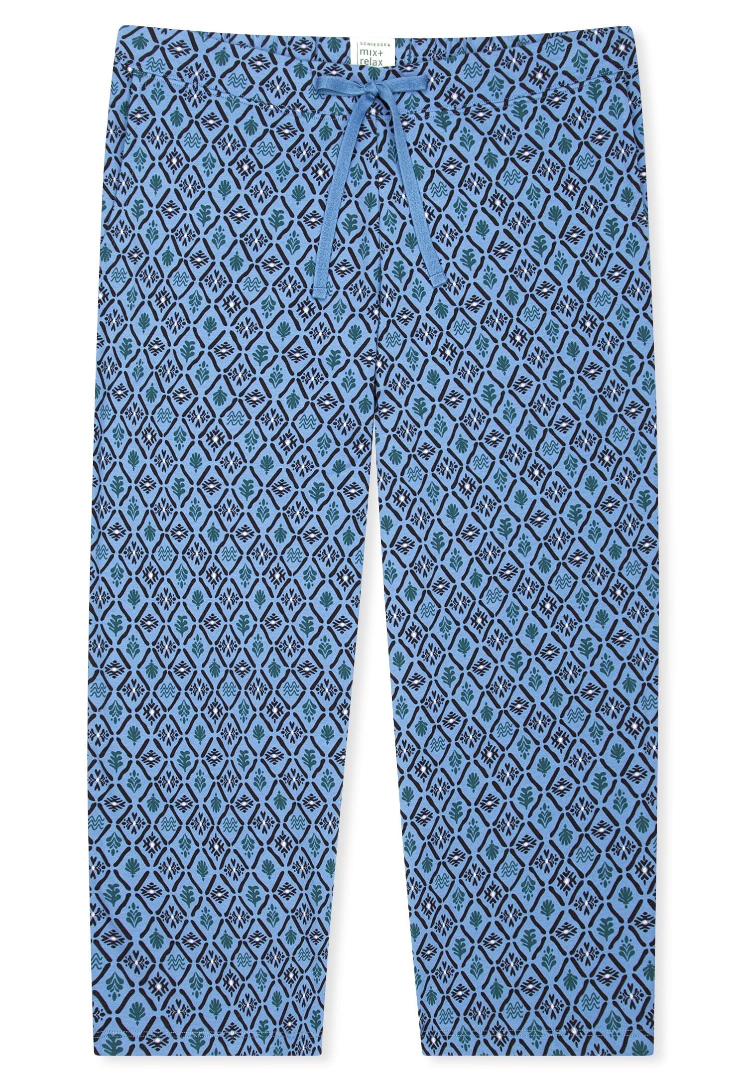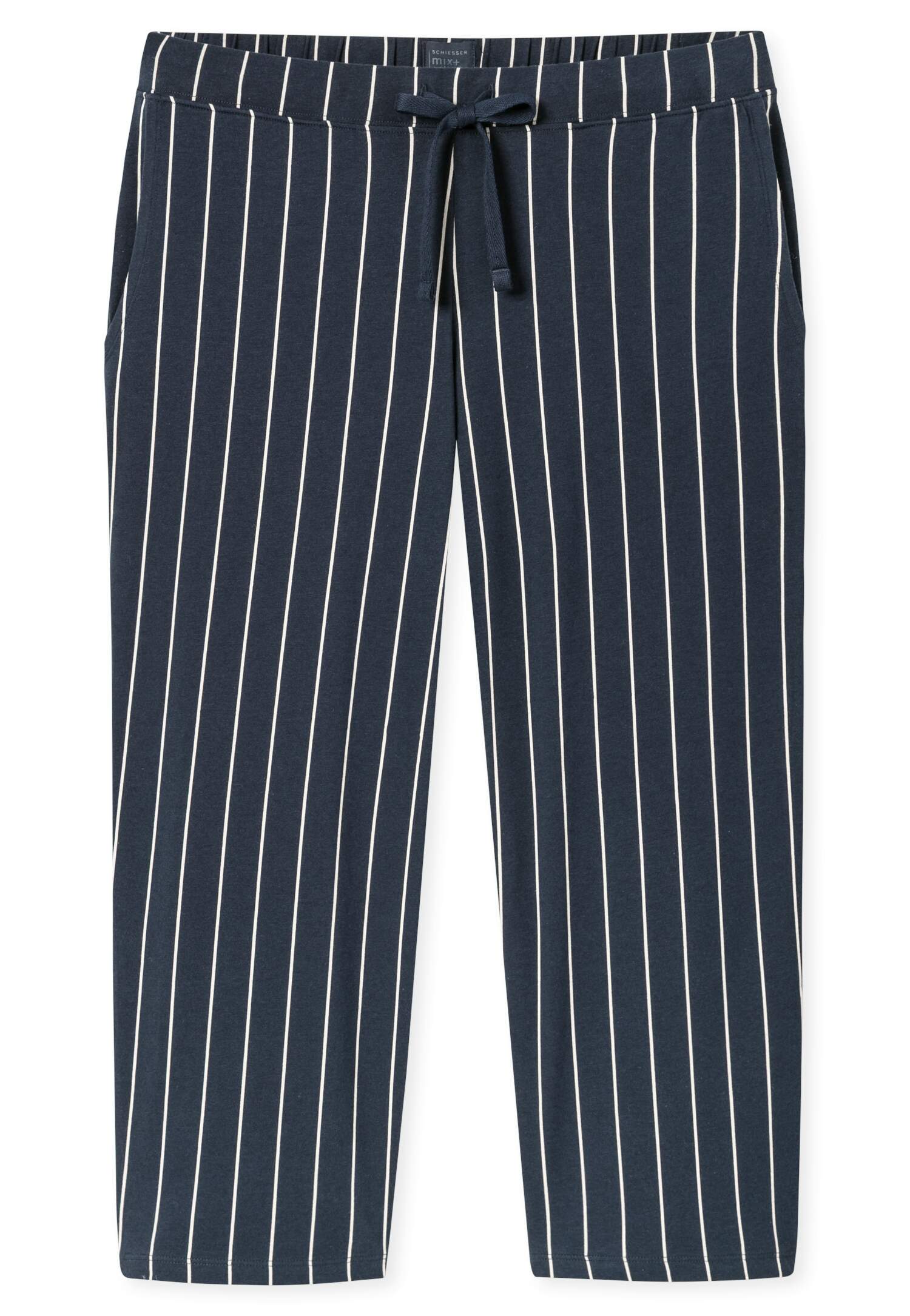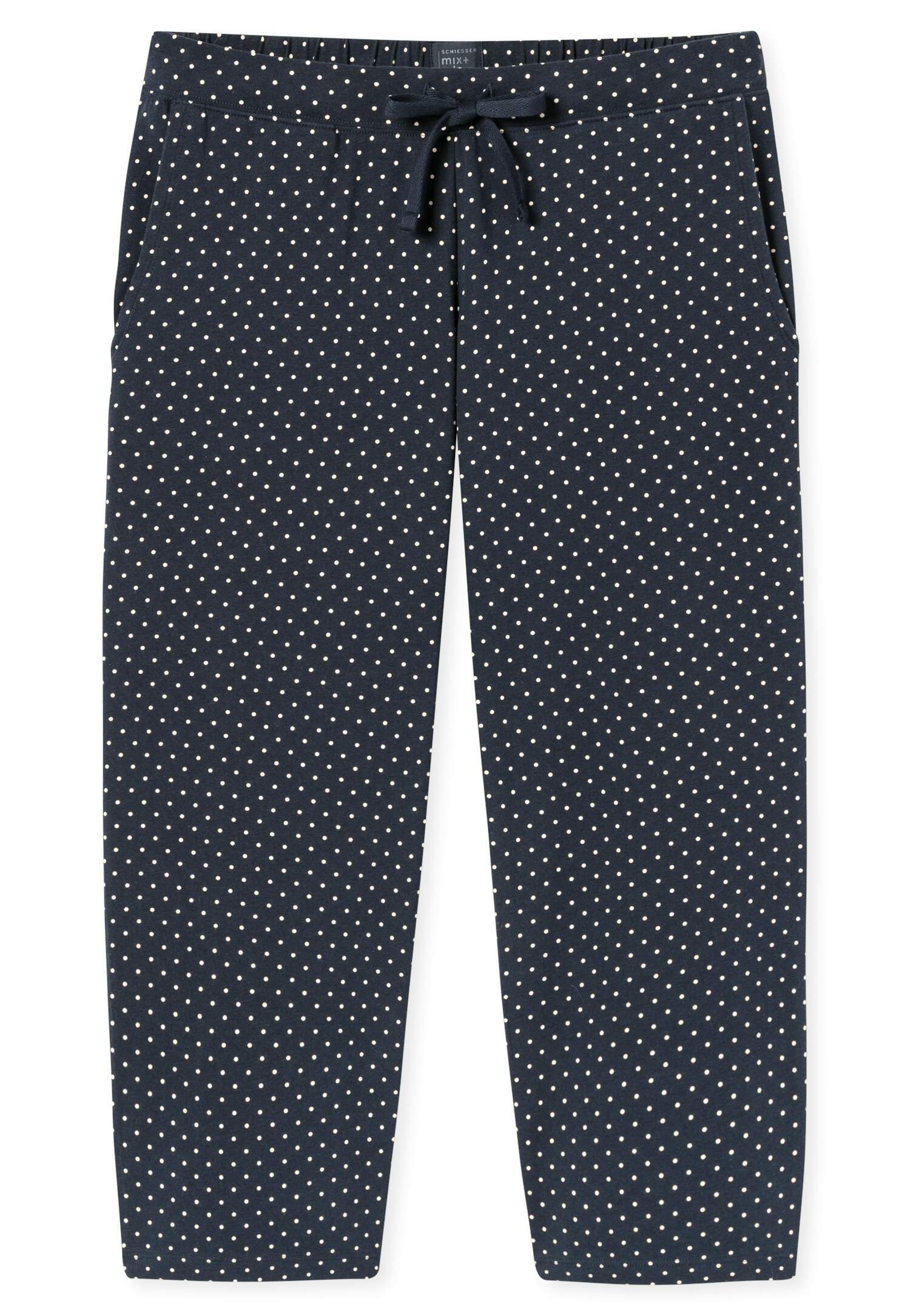 3/4-lange Hose für Damen mit Punkten in Weiß auf Dunkelblau, aus der beliebten SCHIESSER Serie 'Mix+Relax', Bund mit Bindeband, seitliche Taschen, unsere Models tragen Größe 38/M, in softer, elastischer Single Jersey-Qualität