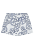 weiße, kurze Damenhose mit blauem SCHIESSER Armbrust Statement-Druck , aus der SCHIESSER Serie 'SCHIESSER 150 Years', moderne, lässige Schnittform mit weitem Bein, Bund mit Bindekordel, seitliche Taschen, unser Model ist 177 cm groß und trägt Größe 38/M, in hochwertiger Single-Jersey-Qualität aus 100% bester Bio-Baumwolle
