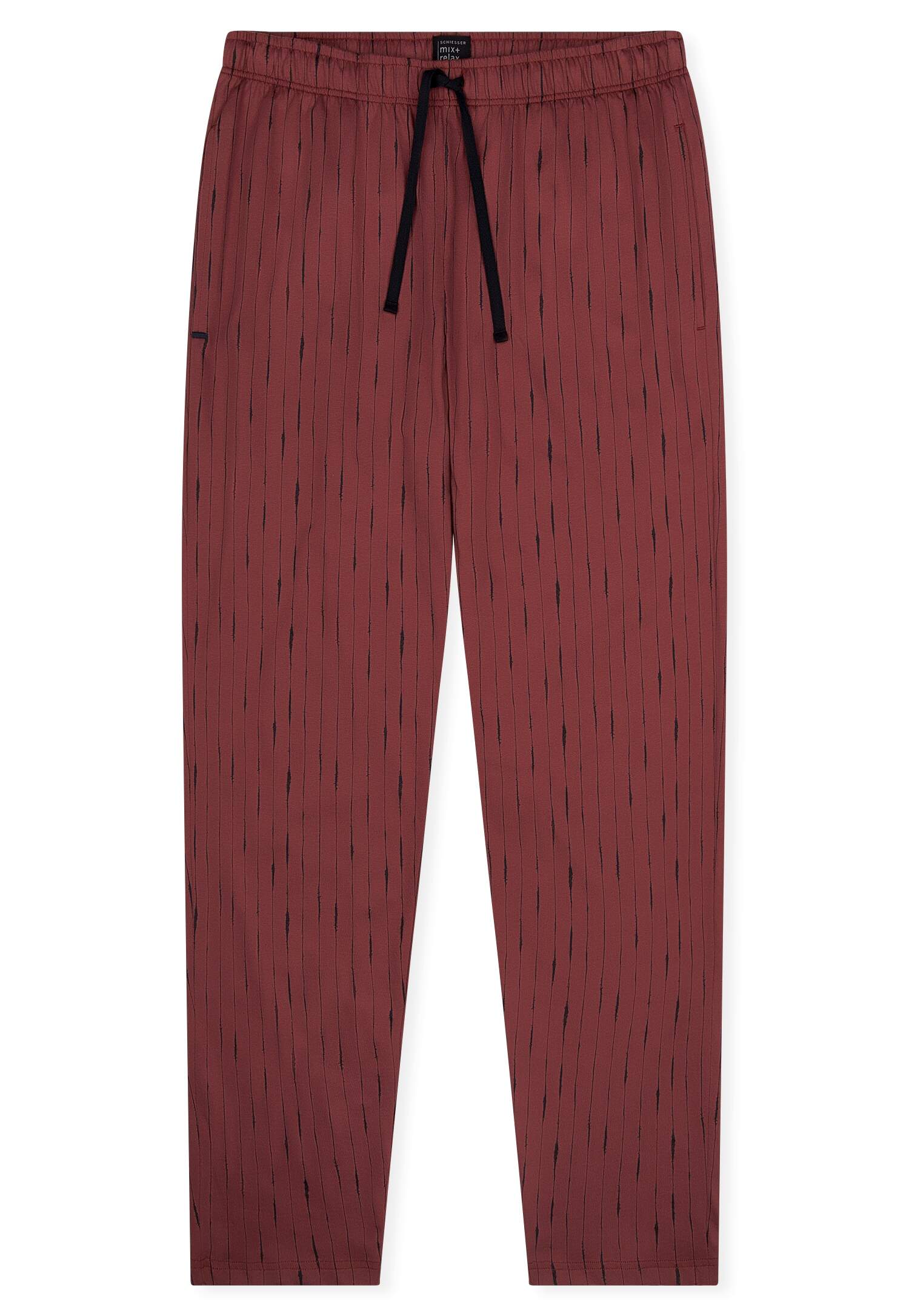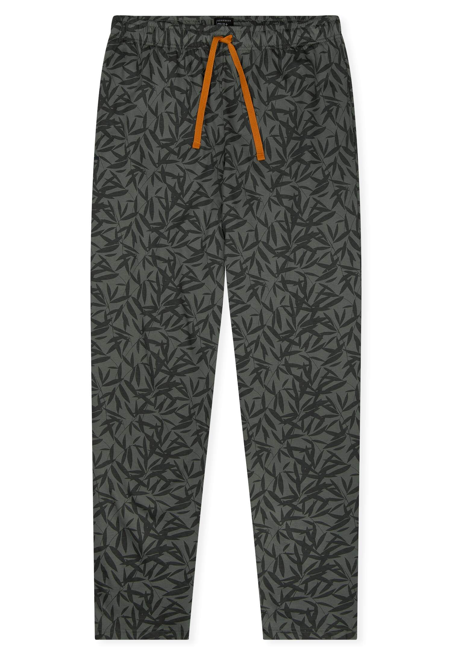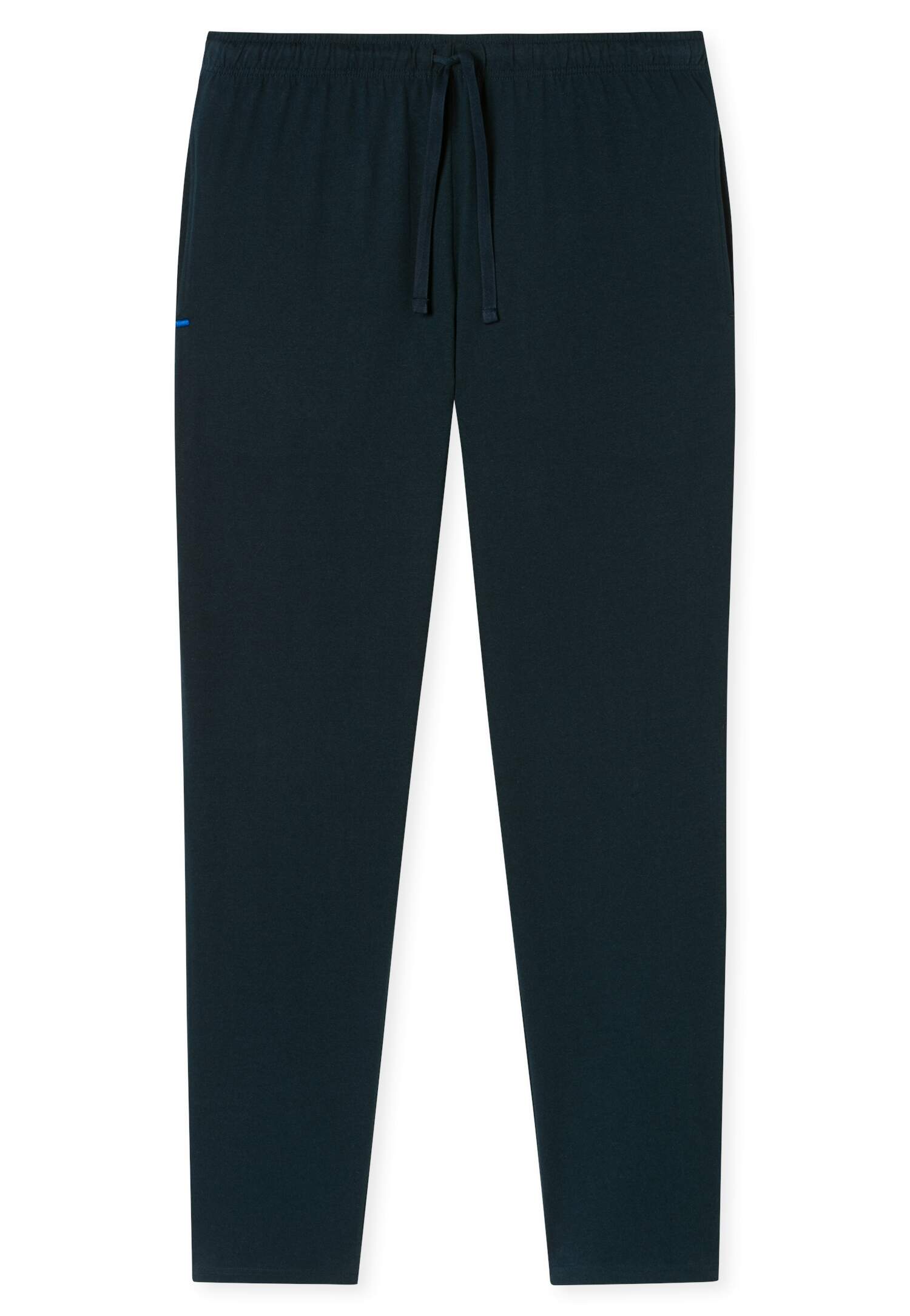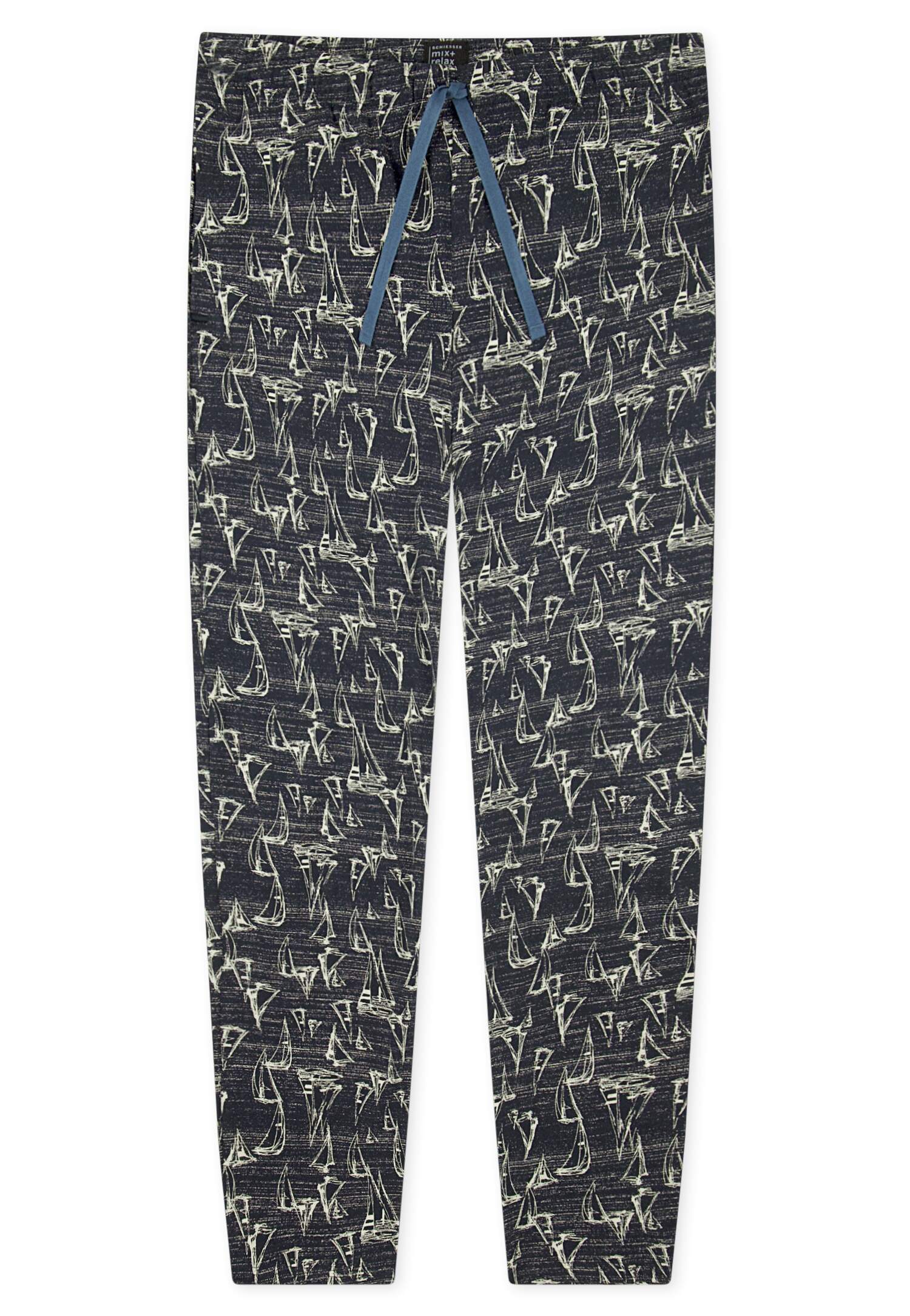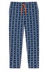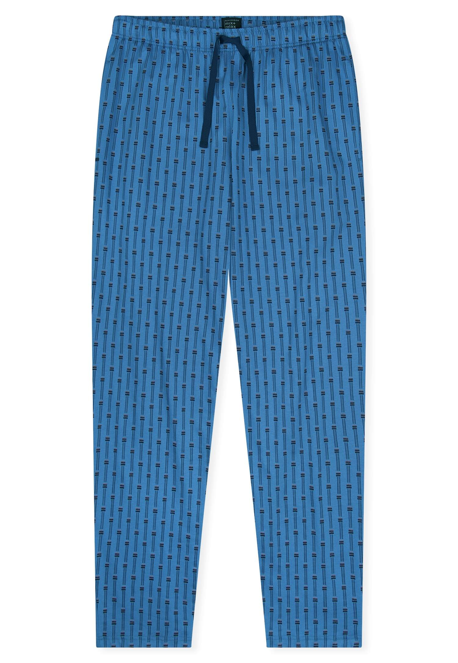 lange, dunkelblaue Herrenhose mit mehrfarbigem Grafik-Print, aus der beliebten SCHIESSER Serie 'Mix+Relax', Bund mit Bindeband, seitliche Taschen, unsere Models tragen Größe 50/M, in weicher Single-Jersey-Qualität