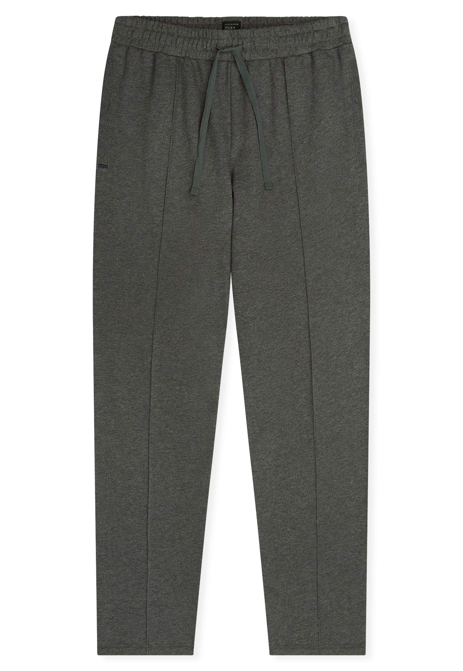 dunkelgraue, lange Hose für Herren mit dezentem, tonalem Muster, aus der beliebten SCHIESSER Serie 'Mix+Relax', moderne, lässige Passform, Bund mit Bindekordel, mit Biesen am Bein und seitlichen Taschen, unsere Models tragen Größe 50/M, hochwertiges Material in feiner Sweat-Qualität