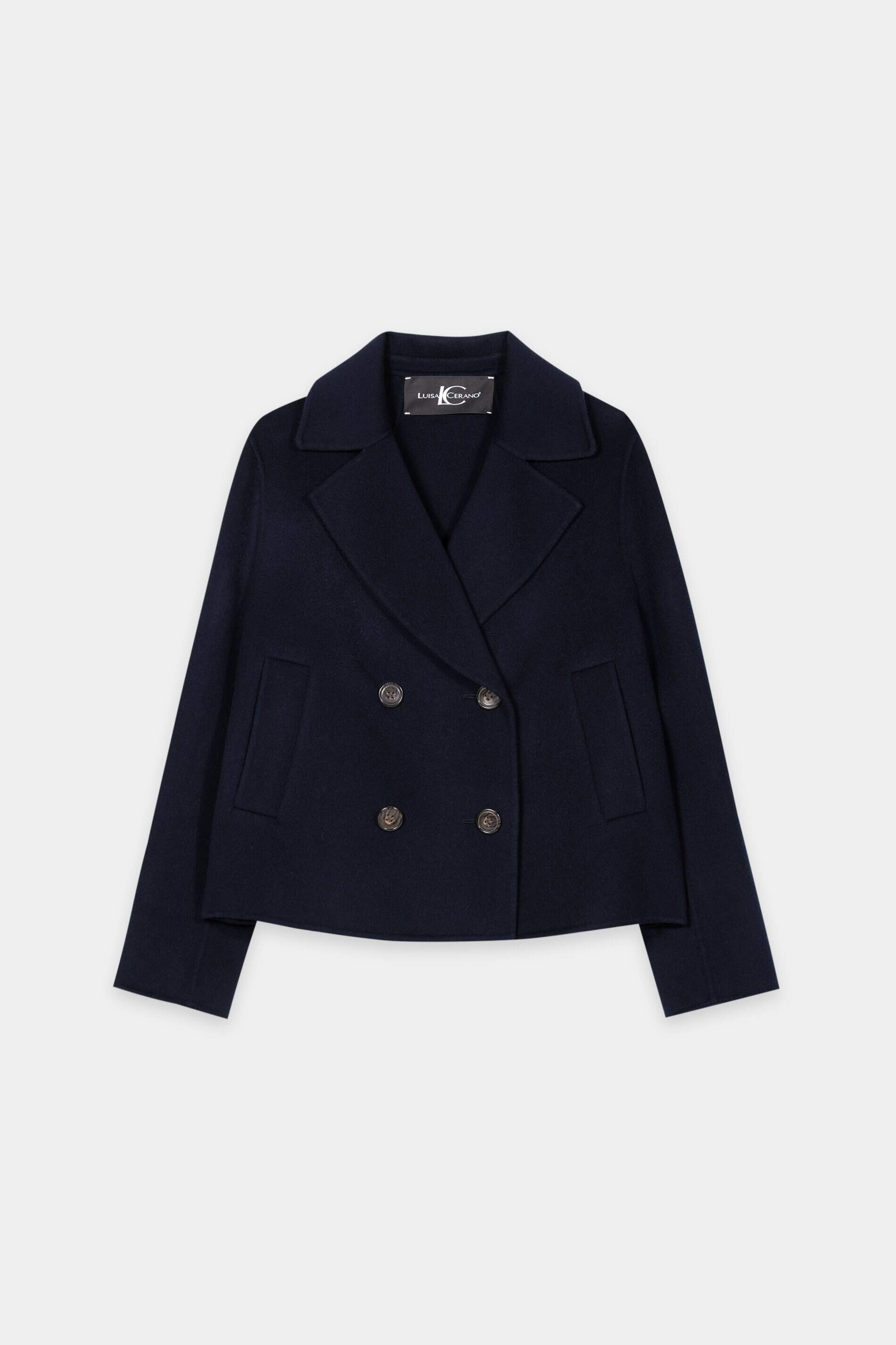 Verkürzte Cabanjacke aus luxuriöser Wolle-Kaschmir-Mischung in edler, handgemachter Doubleface-Verarbeitung. Die doppelreihig geknöpfte Jacke besitzt einen klassischen Reverskragen und zwei seitliche Eingrifftaschen.