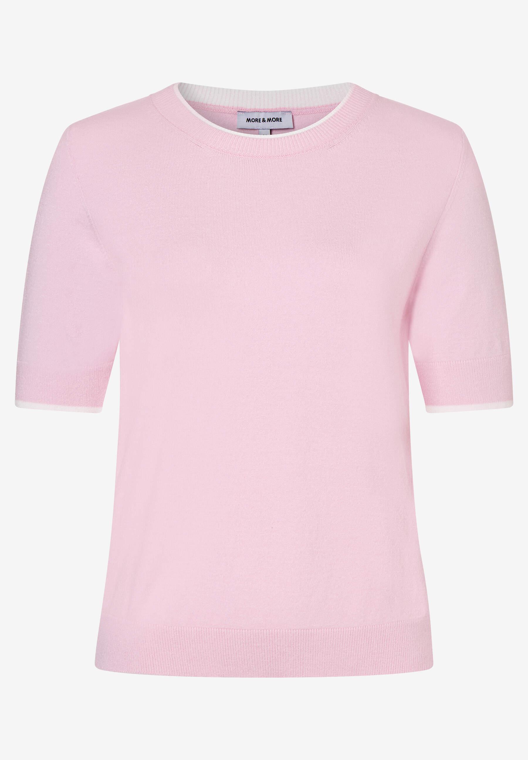 Der attraktive Kurzarm-Pullover von MORE & MORE mit feinen, weißen Streifen am Ausschnitt und an den Ärmeln sieht sowohl zum Rock als auch zur Hose sehr gut aus.
