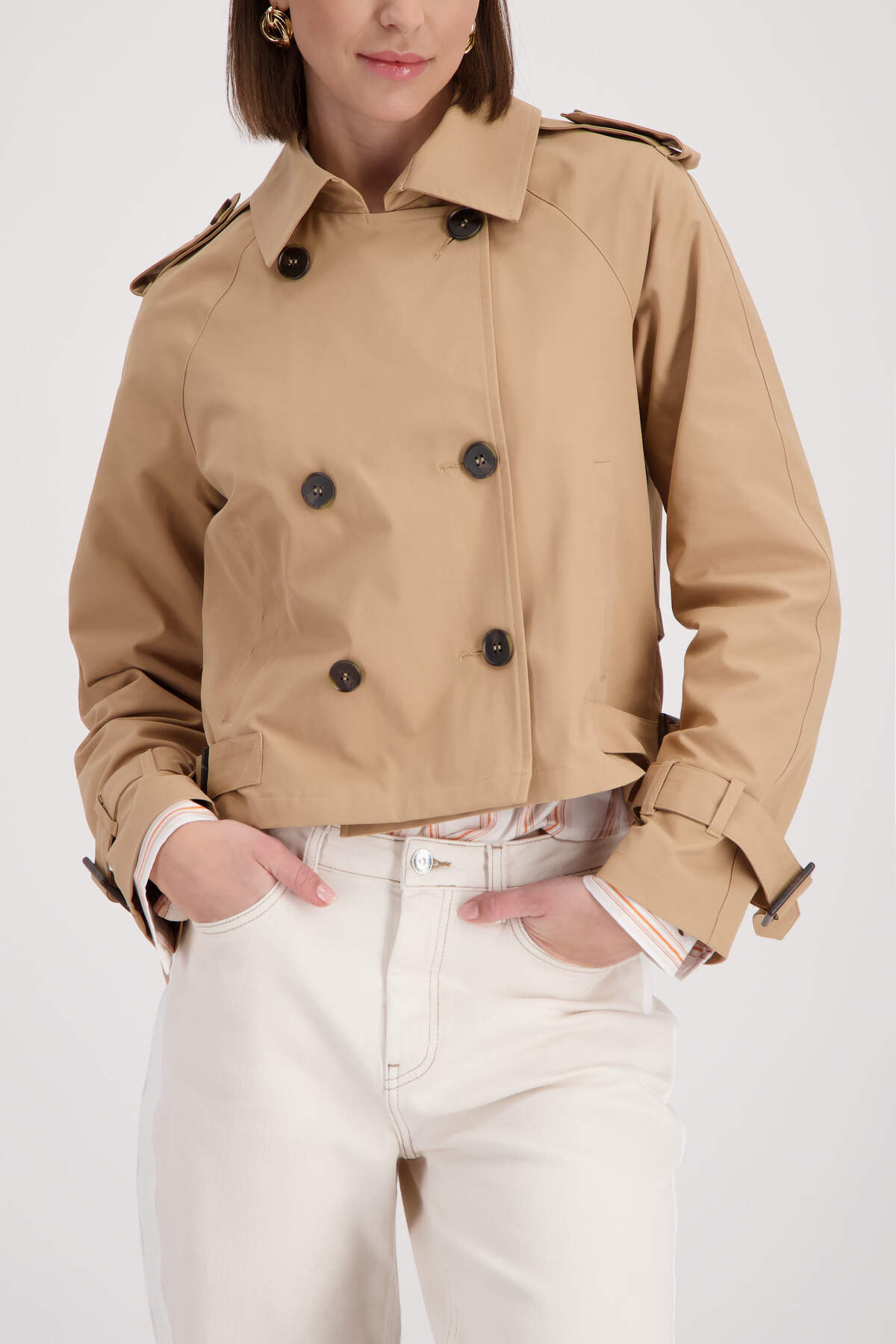 Die kurze, stylische Trenchjacke überzeugt mit Schulterriegeln, Ärmel- und Seitenriegeln mit Schnalle sowie einer doppelten Knopfleiste.