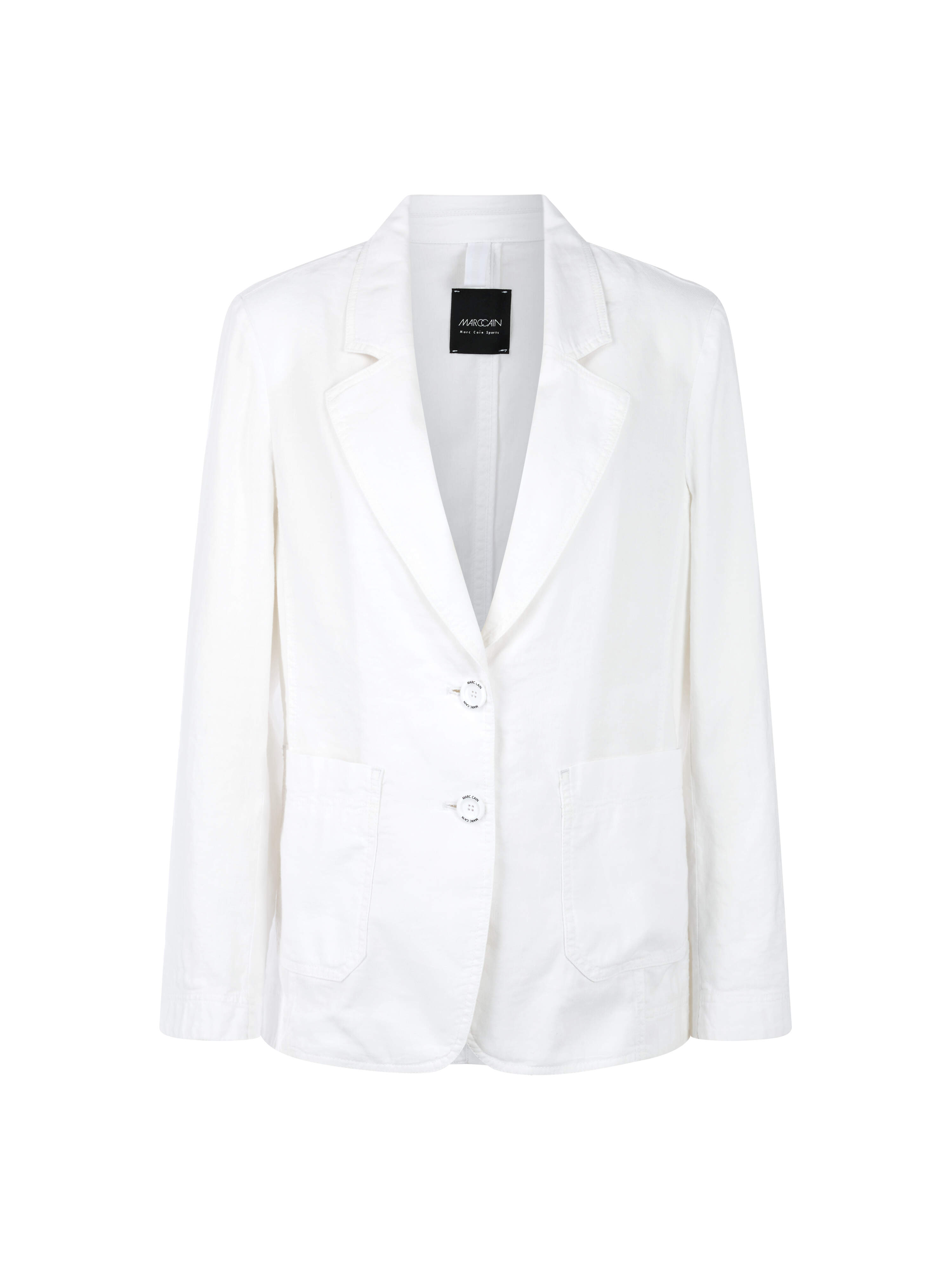 Lockerer Blazer|Blazer mit lockerem Schnitt und luftig-leichtem Materialmix. Er kommt mit klassischem Revers Kragen, einreihiger Knopfleiste mit Marc Cain Logo und langen Ärmeln. Seitliche Taschen ergänzen den Look. Ein kleiner Schlitz auf der Rückseite sorgt für optimale Bewegungsfreiheit. Durch den angenehmen Materialmix mit Baumwolle und Leinen eignet er sich perfekt für die wärmeren Tage.|Lockere Form|Klassisches Revers|Einreihige Knopfleiste|Baumwollmix|Das Model ist 179 cm groß und trägt N3/38.