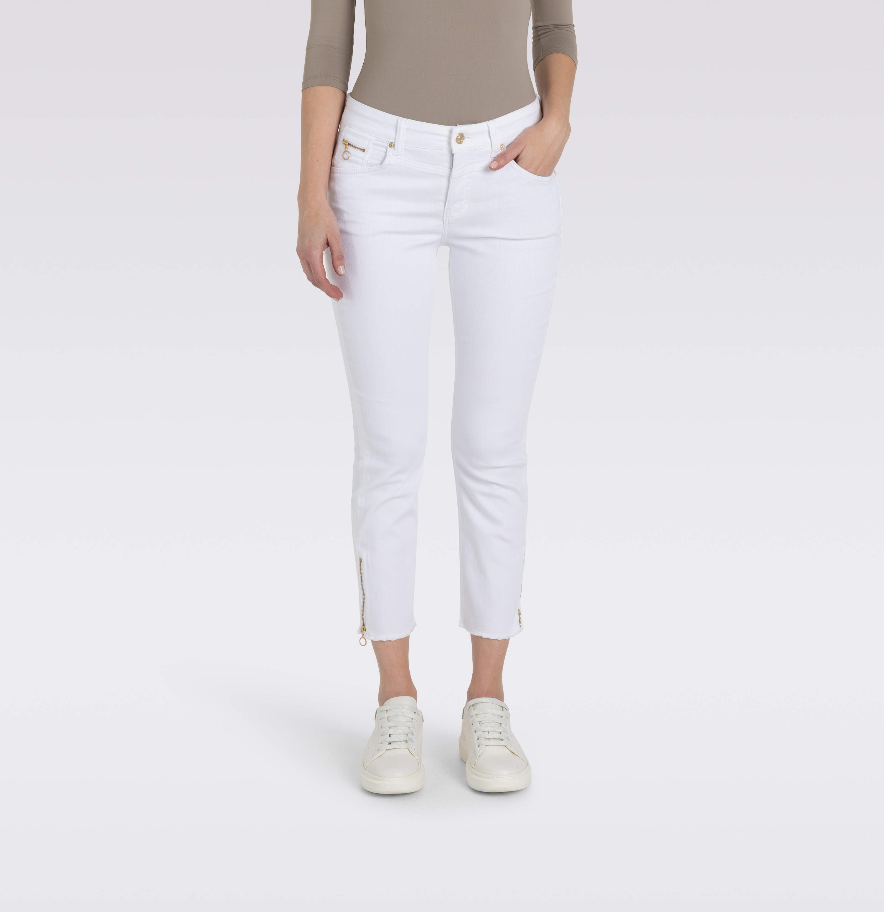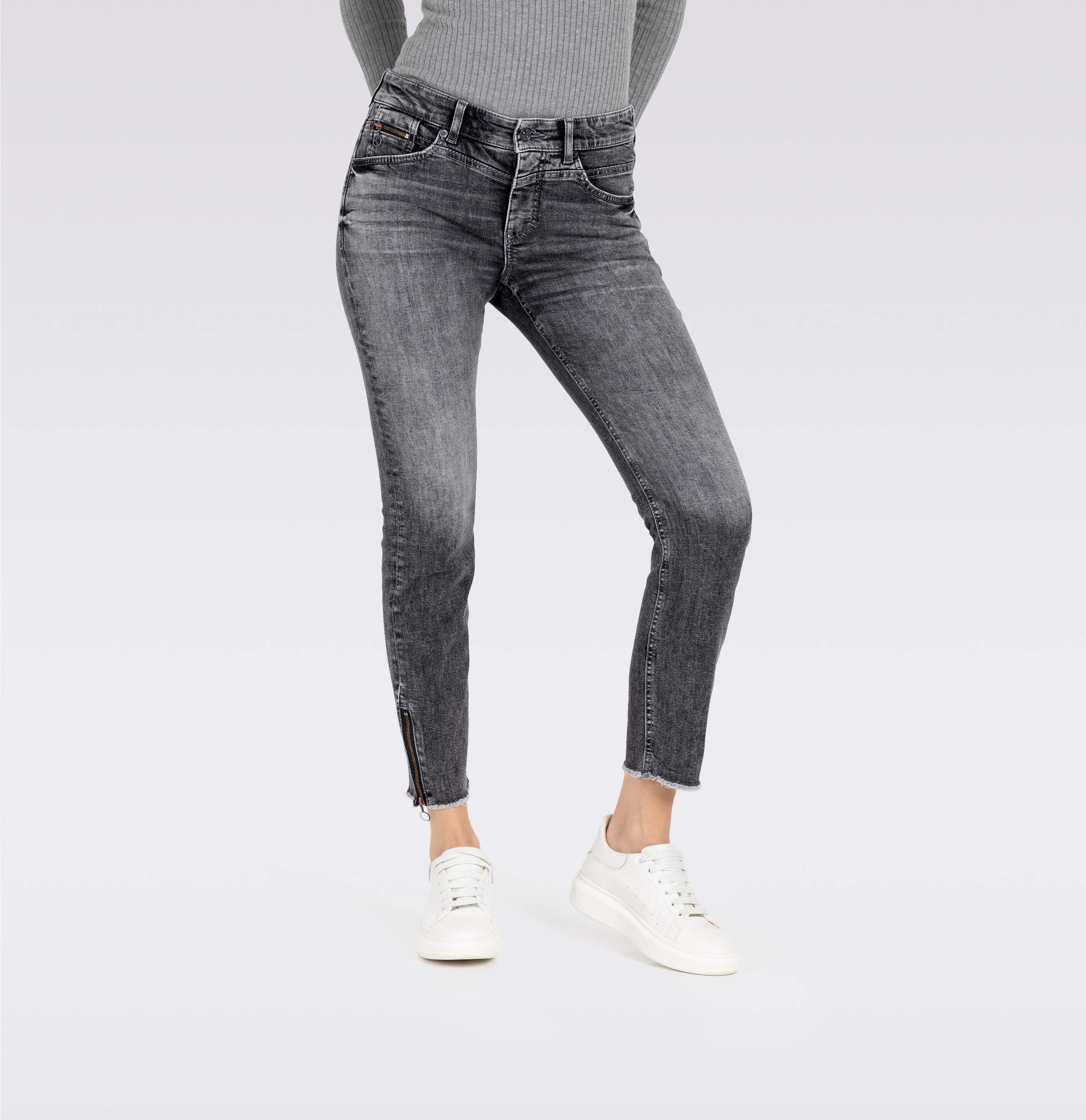 Slim Fit, Slim Leg, schmales, gerades Bein, verkürzte Länge, mittlere Leibhöhe, bequeme Taille, Five Pocket, Zipper an der Münztasche, Naht-Details an den Gesäßtaschen, Reißverschluss am Beinabschluss, offener Saum, Light Authentic Denim, sehr hautfreundliche und atmungsaktive Denim-Qualität mit Modal, leicht im Gewicht, sehr softer Griff, Indigo Flow-Färbeverfahren für weniger Einsatz von Chemie und Farbstoff, authentische Optik, hoher Tragekomfort, Das Model ist 1,75m groß und trägt die MAC Hosengröße 36, Fußweite bei Größe 36: 30cm
