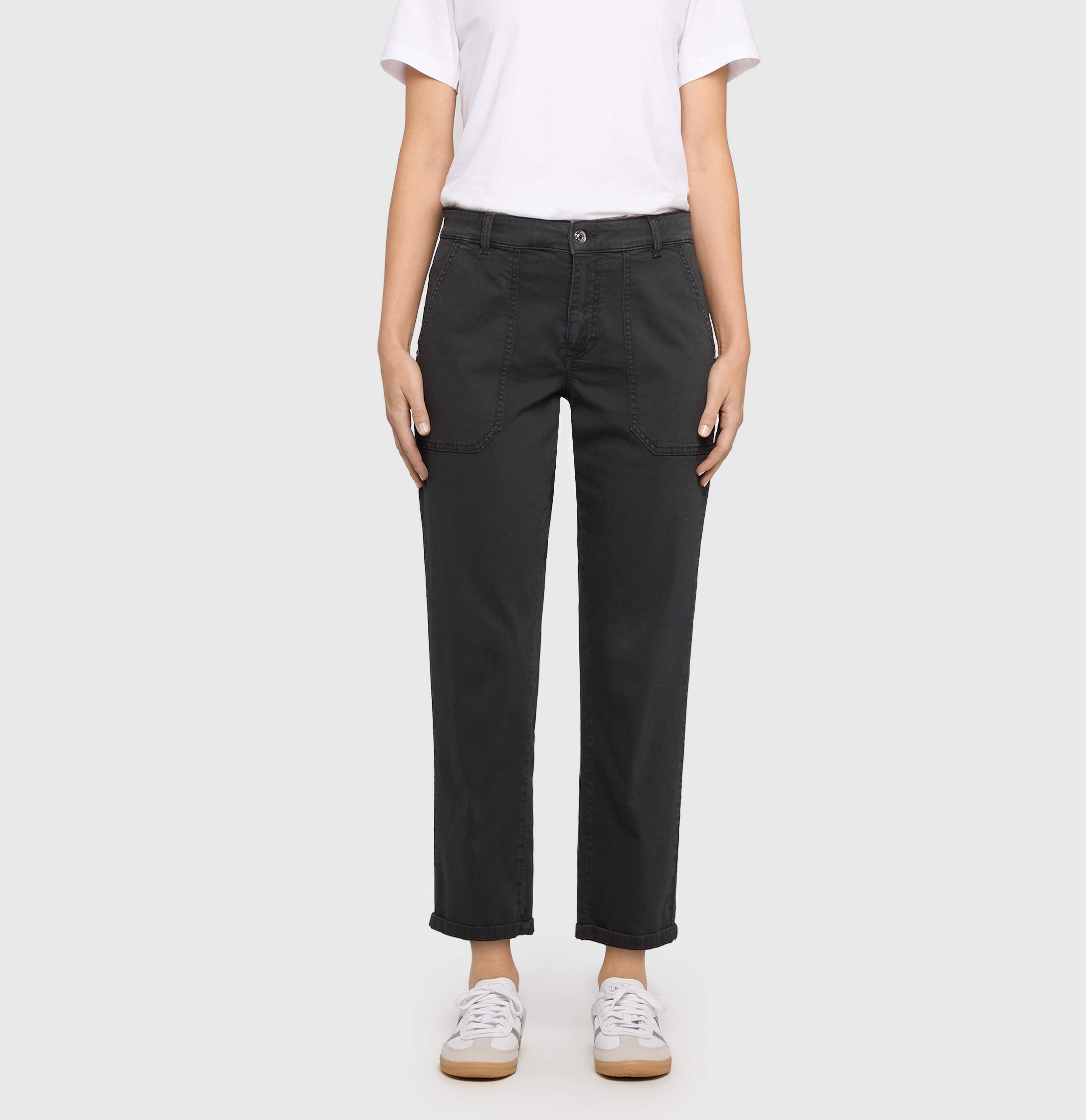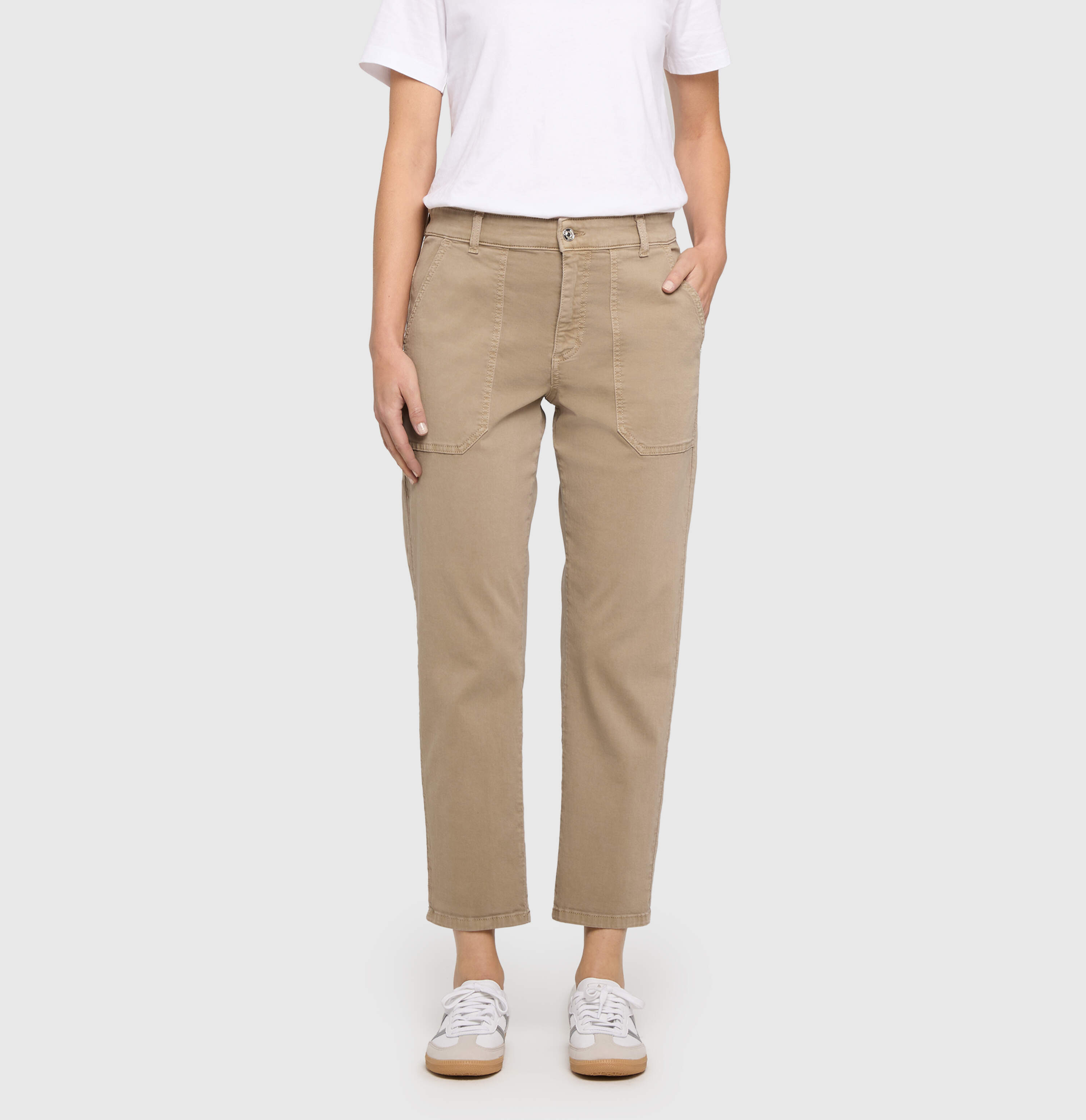 Relaxed Fit, Straight Leg, gerades, lässig sitzendes Bein, mittlere Leibhöhe, Utility Style, große, aufgesetzte Taschen, dezent umgekrempelter Saum, Baumwoll-Gabardine, hochwertige, kompakte Qualität, authentischer, sportiver Look, weicher Griff, hervorragende Passform, hoher Tragekomfort, Das Model ist 1,75m groß und trägt die MAC Hosengröße 36, Fußweite bei Größe 36: 38cm
