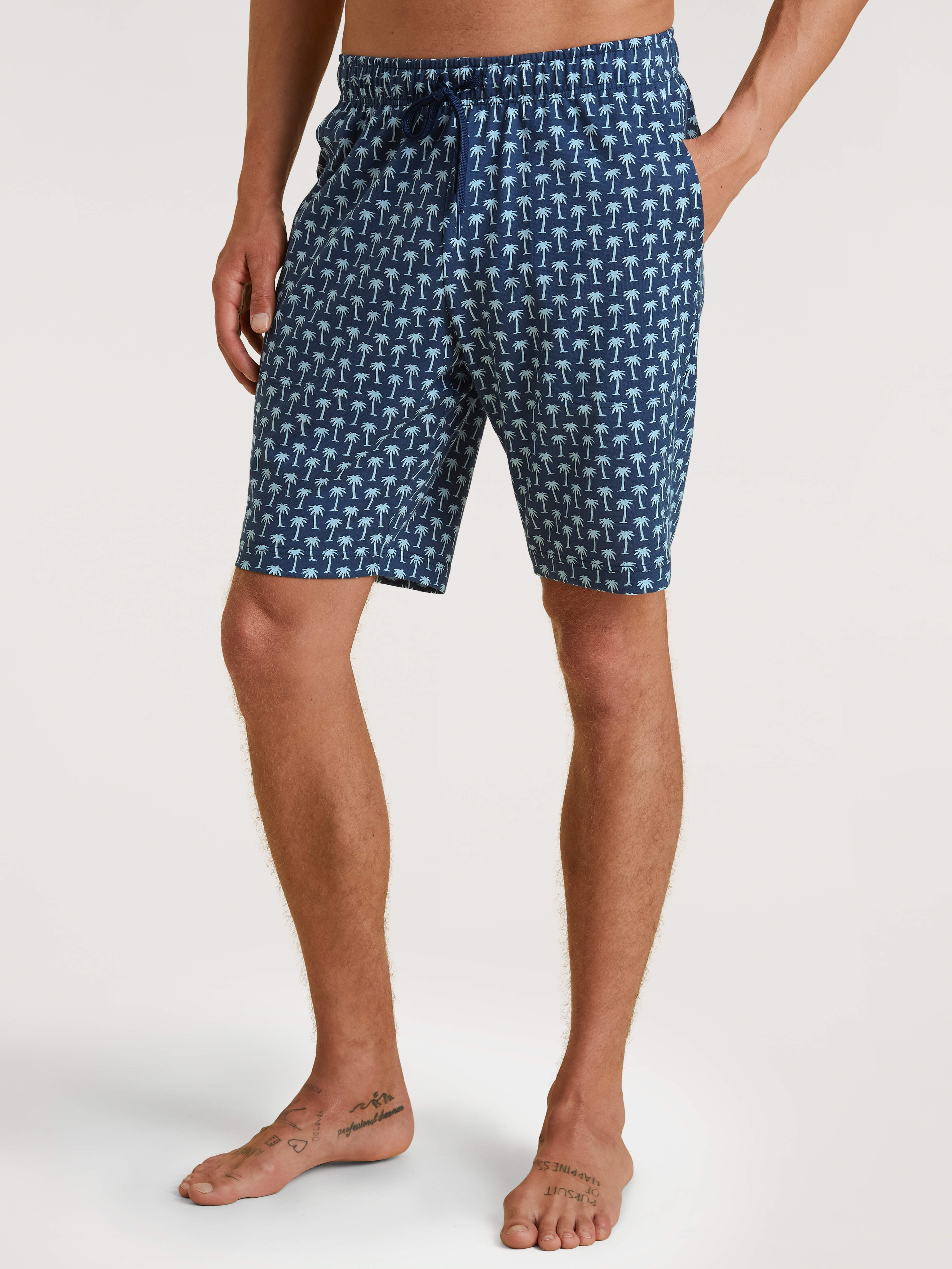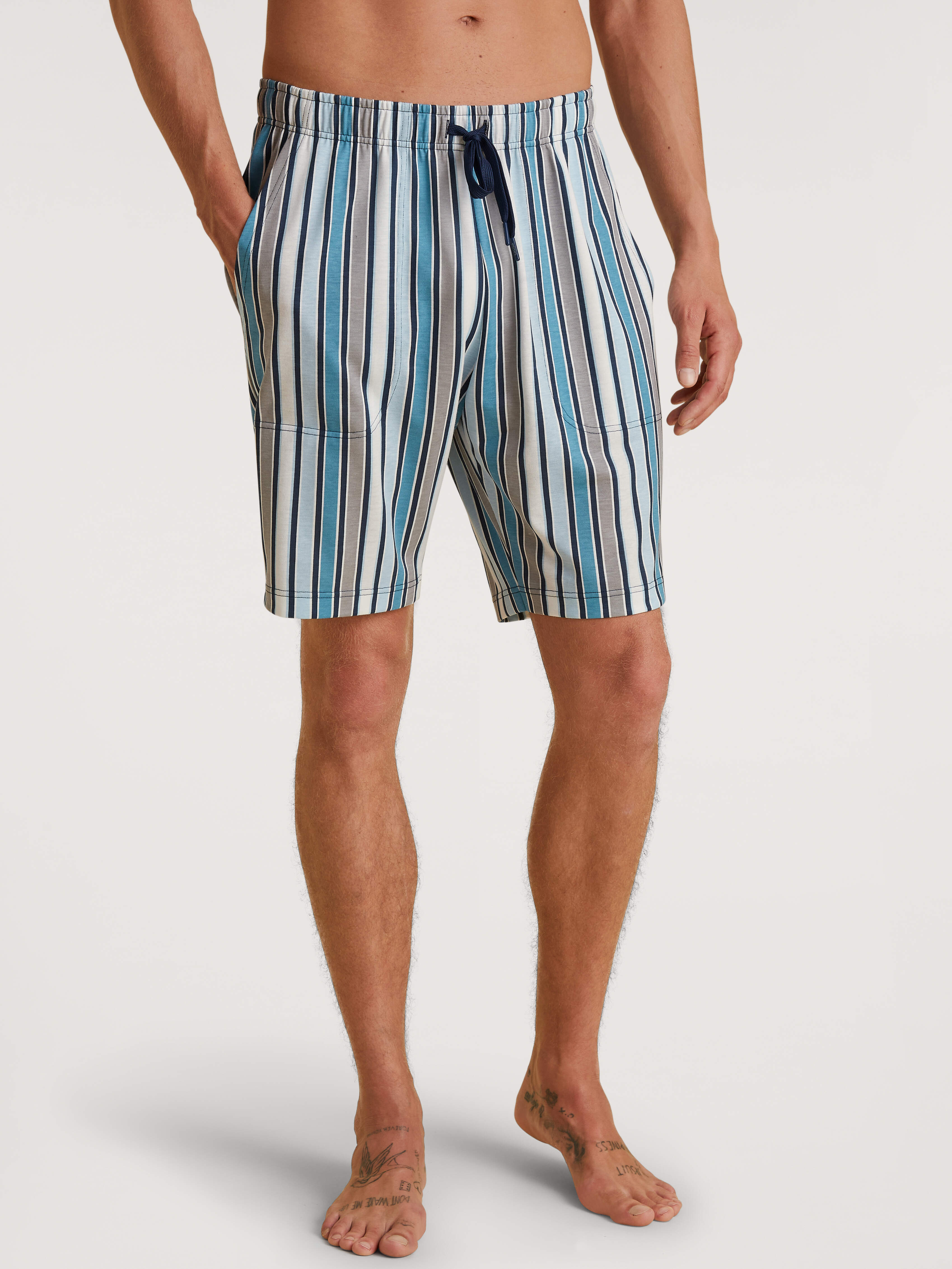 Modern-fit shorts with side pockets|100% cotton|single jersey weave|drawstring waistband with jersey tie|CALIDA mini logo on left side of waistband|high comfort|versatile for mixing and matching