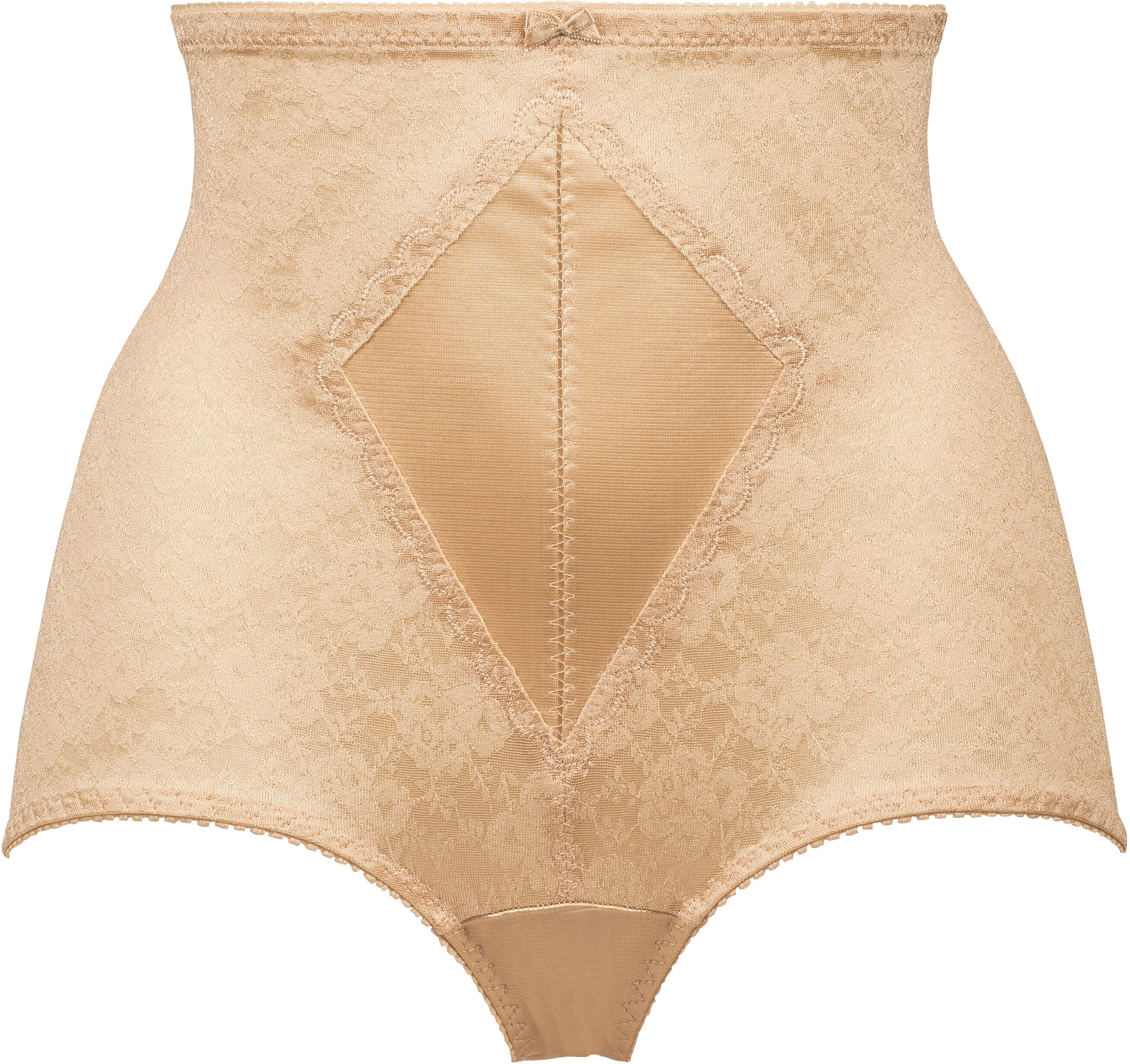Miederhose aus floral gemustertem Jacquard. Das Material ist funktional, trotzdem angenehm im Tragekomfort und nicht zu kraftvoll. In der Frontpartie ist eine leicht elastische Bauch-weg-Patte eingearbeitet. Die Rückenmittelnaht ist in Form geschnitten.