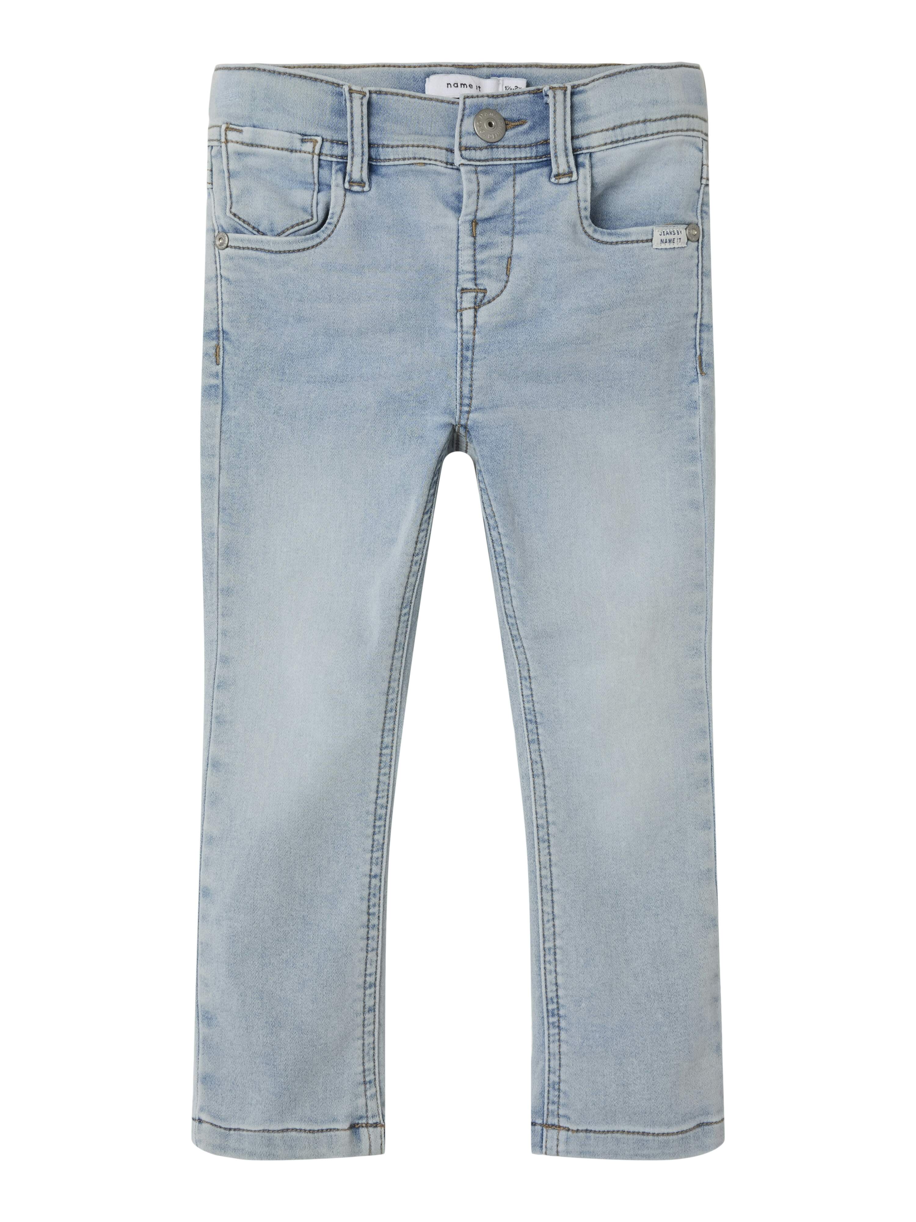 Finde die perfekte Jeans und überrasche dein Kind mit zeitlosen Styles, die einen coolen Look und jede Menge Bewegungsfreiheit bieten. Sweatdenim ist ein weicher Stoff mit einem echten indigoblauen Jeans-Look, der sich bequem trägt und klassisch wirkt.- Produktart: Slim Fit Jeans- Taschen : Gesäßtaschen- Taschen : Fronttaschen- Wash/Finish : Starke Abnutzungserscheinungen- Verschluss : Druckknopfverschluss und halber Zierhosenschlitz (Größe 80–110) oder Hosenschlitz mit Haken- und Reißverschluss (Größe 116–164)- Weitere Details : Verstellbarer Bund- Weitere Details : Label- Weitere Details : Nieten- Wash/Finish : Starke Abnutzungserscheinungen- Passform : Slim Fit- Passform : Diese Jeans hat einen Slim Fit an der Hüfte und an den Beinen