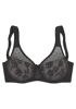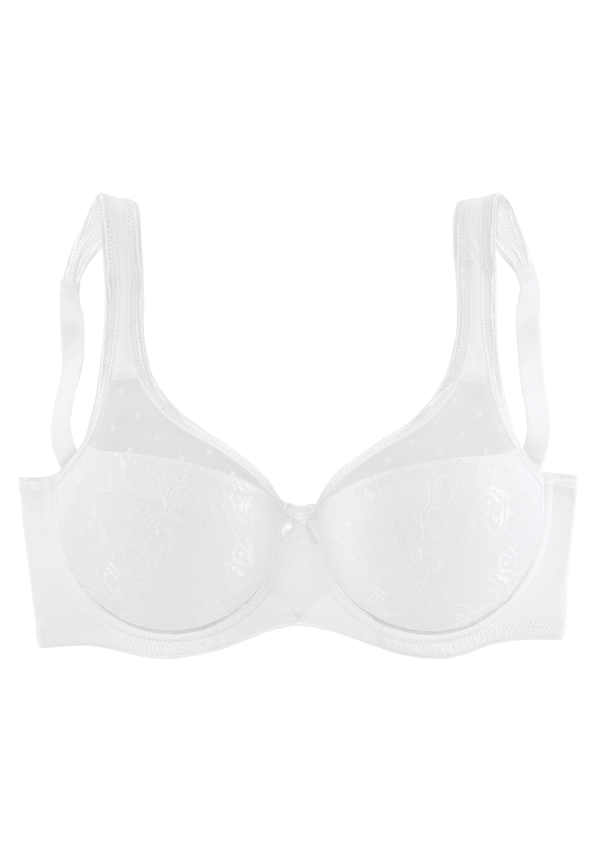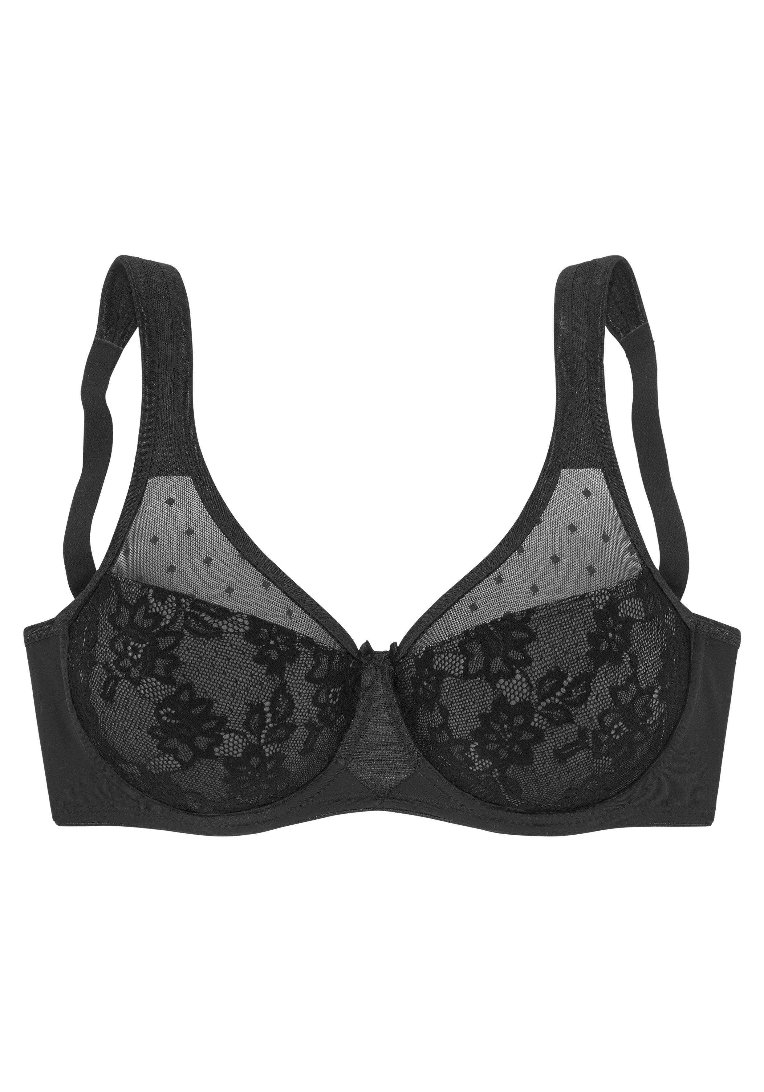 Mimimizer-BH von NUANCE; Verkleinert optisch die Büste; Breite gefütterte Träger; Hoher Steg; Obercups aus leicht transparentem Tüll; Untercups blickdicht unterlegt und mit Jacquardspitze verziert; Verstellbarer Rückenverschluss und verstellbare Träger