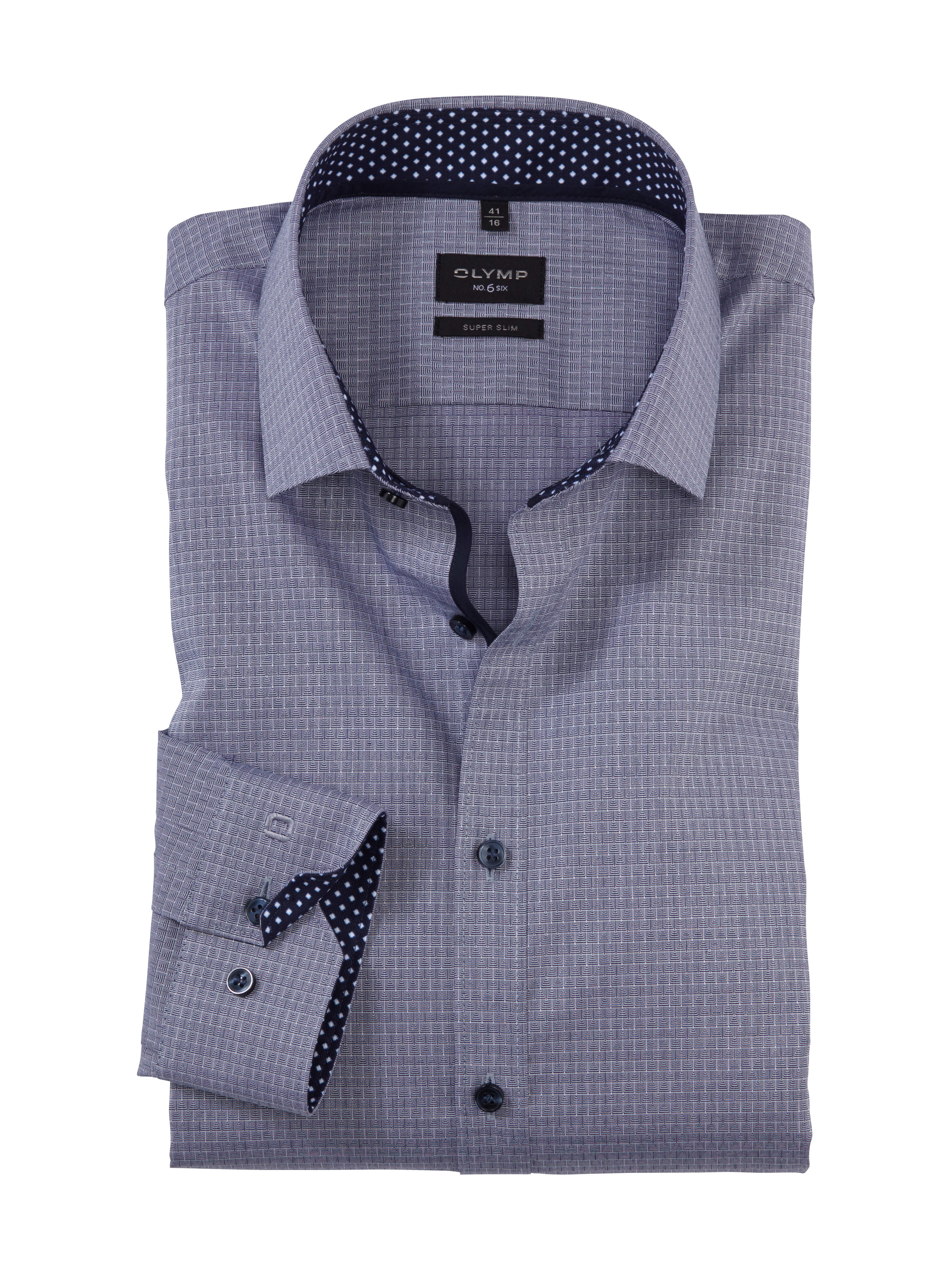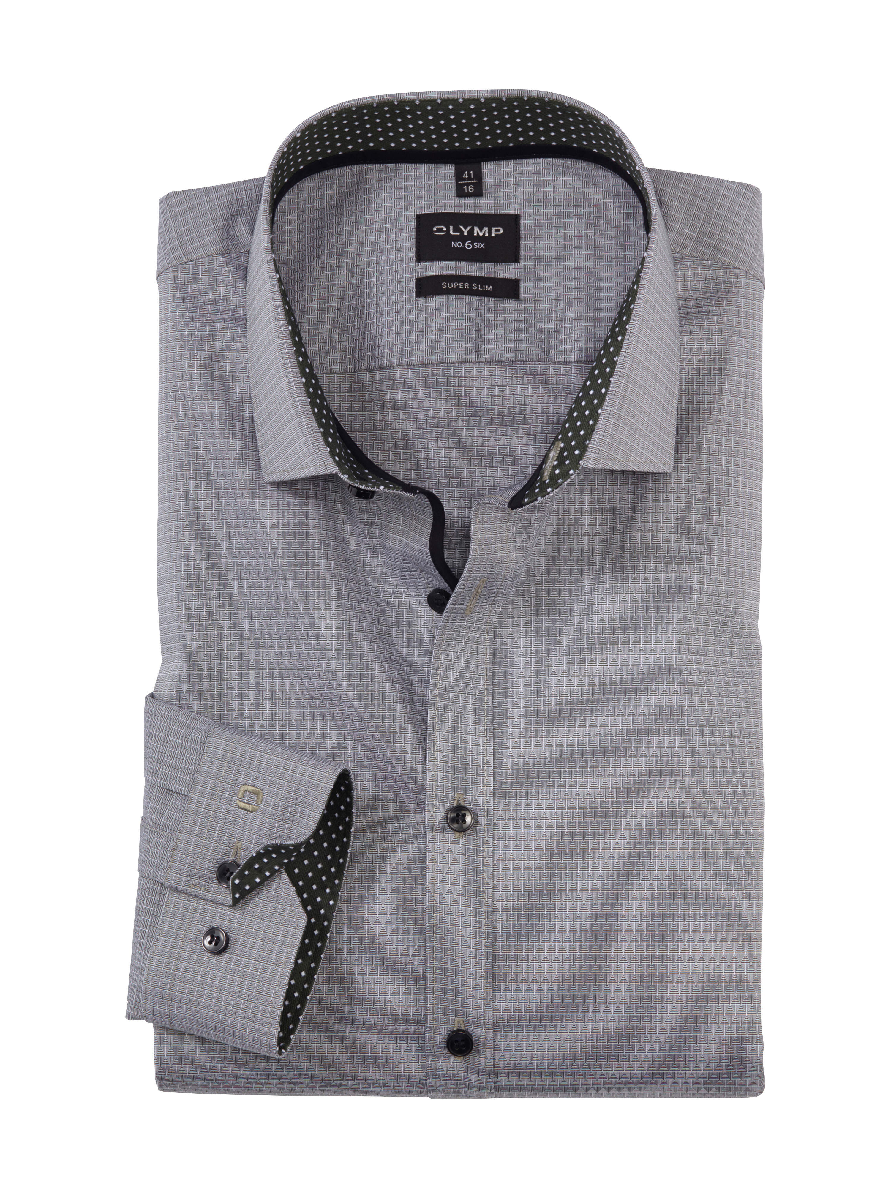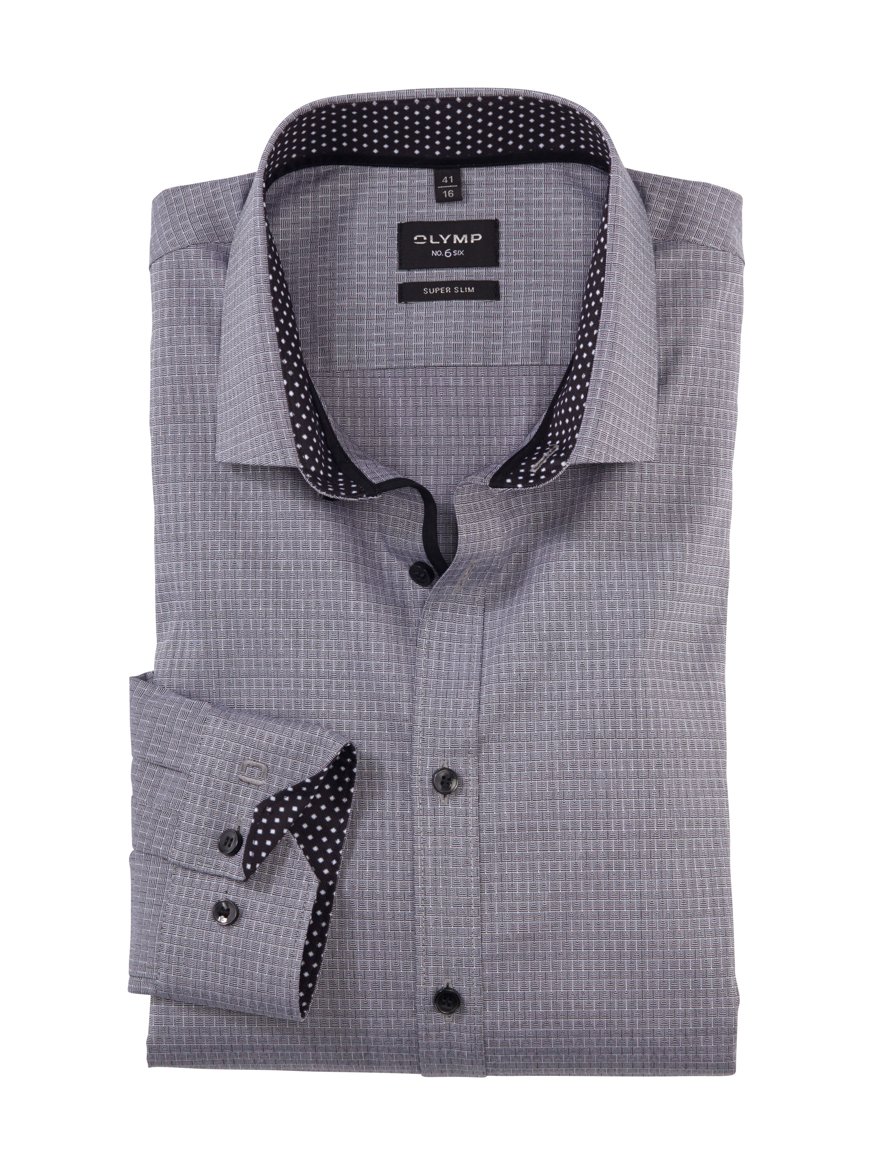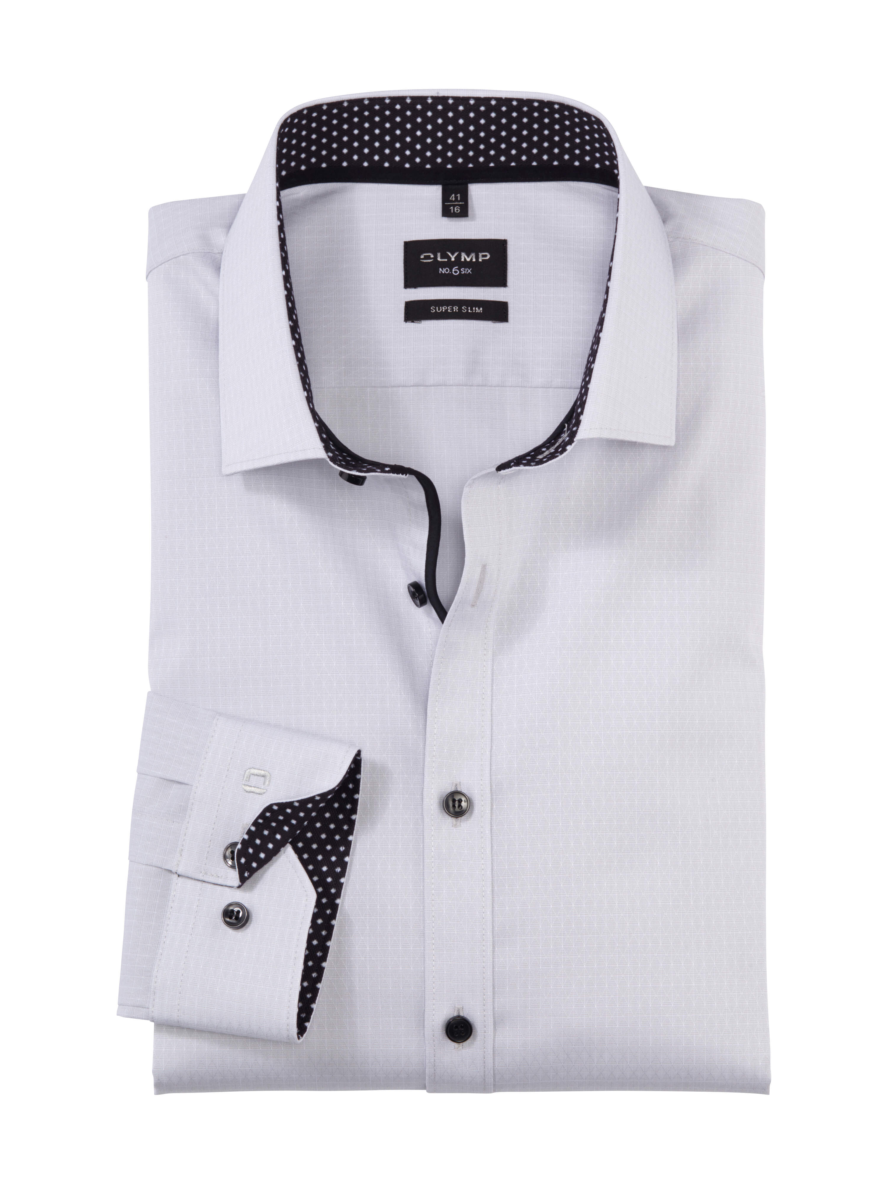 Als modernes Businesshemd für eine sportlich schlanke Zielgruppe überzeugt dieses OLYMP No. Six in Hellgrau. Verarbeitet wurde ein eleganter, glatter Stoff mit geometrischem Web-Dessin, akzentuiert durch dunkle Knöpfe und Kontrastbeschläge. Ein trendaktueller Modern-Kent-Kragen macht die Ausstattung komplett. In bügelleichter Comfort-Stretch-Qualität aus Baumwolle und 3 % Elastolefin.