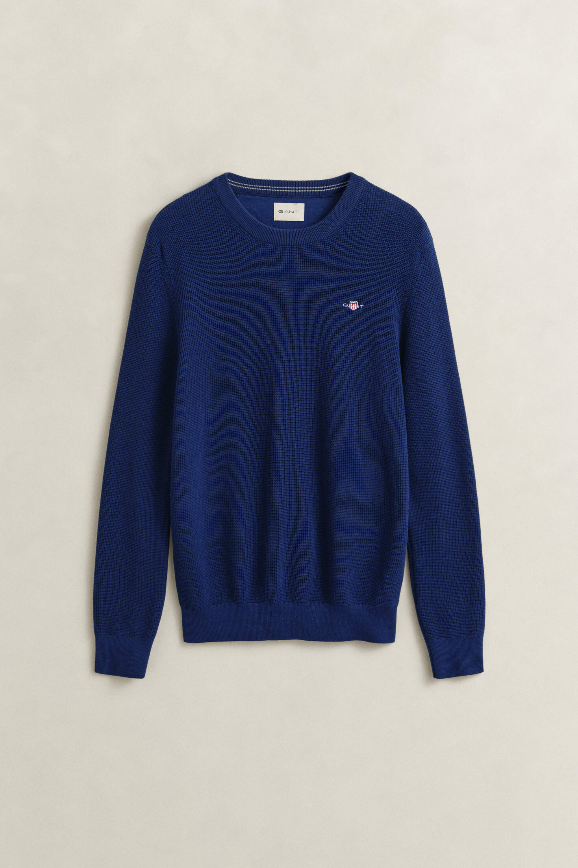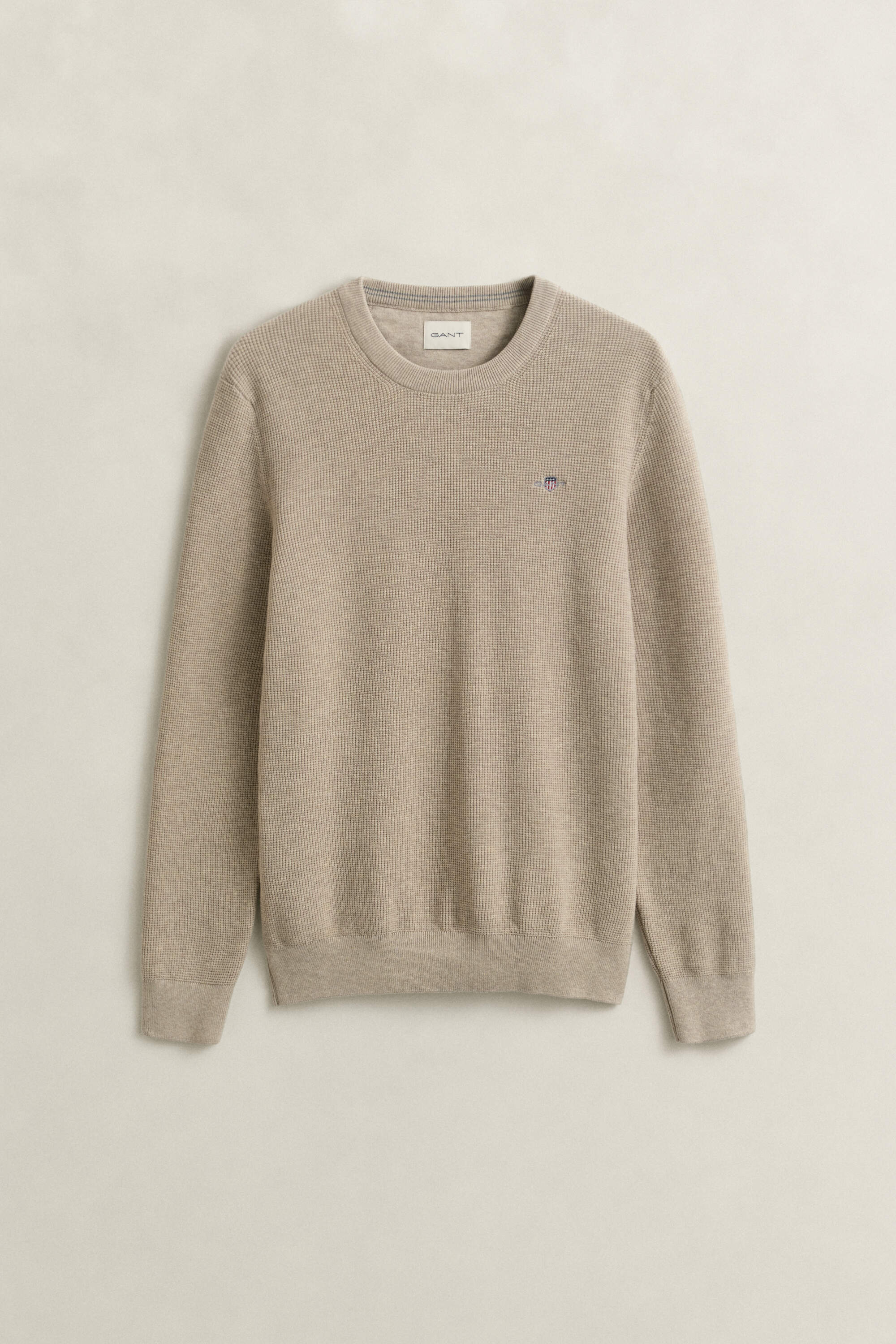 Unser Gant Herren Pullover besteht aus einer Biobaumwollmischung und zeichnet sich durch eine feine Waffelstruktur aus. Er ist im Regular Fit geschnitten und mit einem klassischen Rundhalsausschnitt, gerippten Abschlüssen sowie einer Wappenstickerei versehen.