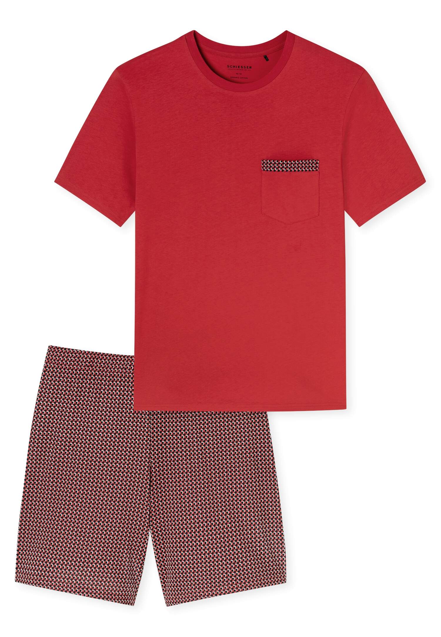 kurzer Herren-Schlafanzug mit karierten Shorts und Shirt in Chilli-Rot, aus der SCHIESSER Serie „Comfort Nightwear“, unifarbenes T-Shirt mit Rundhalsausschnitt, aufgesetzte Brusttasche samt Zierstreifen, gemusterte Shorts mit bequemem Mehrnadelbund, unsere Models tragen Größe 38/M, in angenehm weicher Single-Jersey-Qualität mit 100 % Organic Cotton