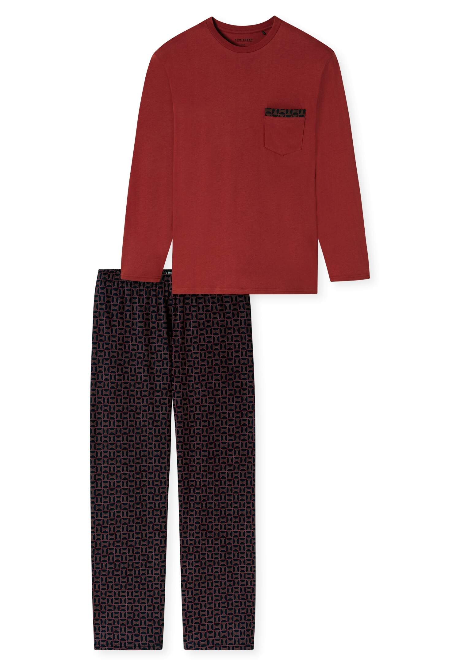 langer Herren-Schlafanzug mit dunkelrotem Shirt und gemusterter Hose in Braungrau, aus der SCHIESSER Serie „Comfort Nightwear“, unifarbenes Langarmshirt mit Rundhalsausschnitt und aufgesetzter Brusttasche mit gemusterter Blende, gemusterte Hose mit bequemem Mehrnadelbund, unsere Models tragen Größe 50/M, auch in großen und Sondergrößen erhältlich, in angenehm weicher Single-Jersey-Qualität