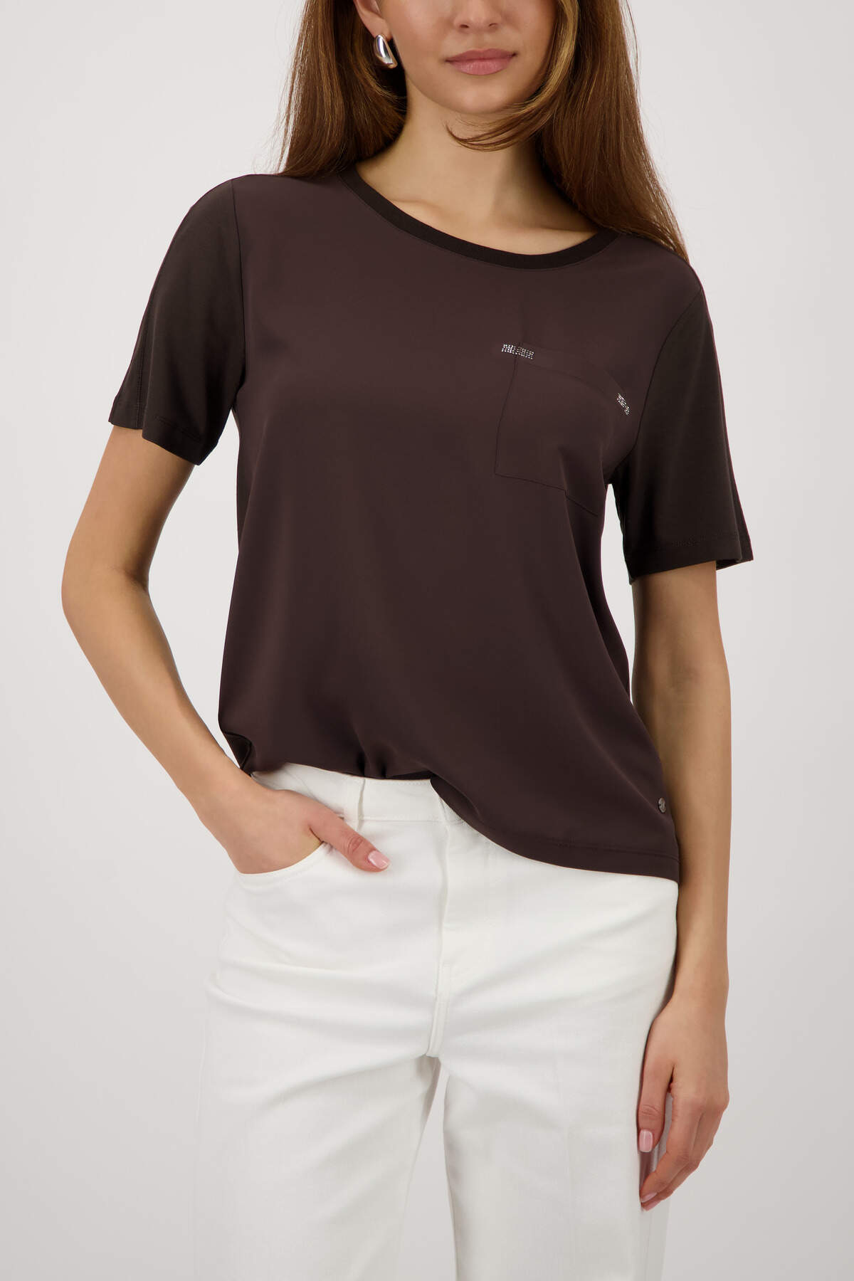 Fließende Viskose trifft auf glänzende Strasssteine – dieses Shirt mit Strass-Details und Brusttasche verleiht jedem Outfit Glanz.