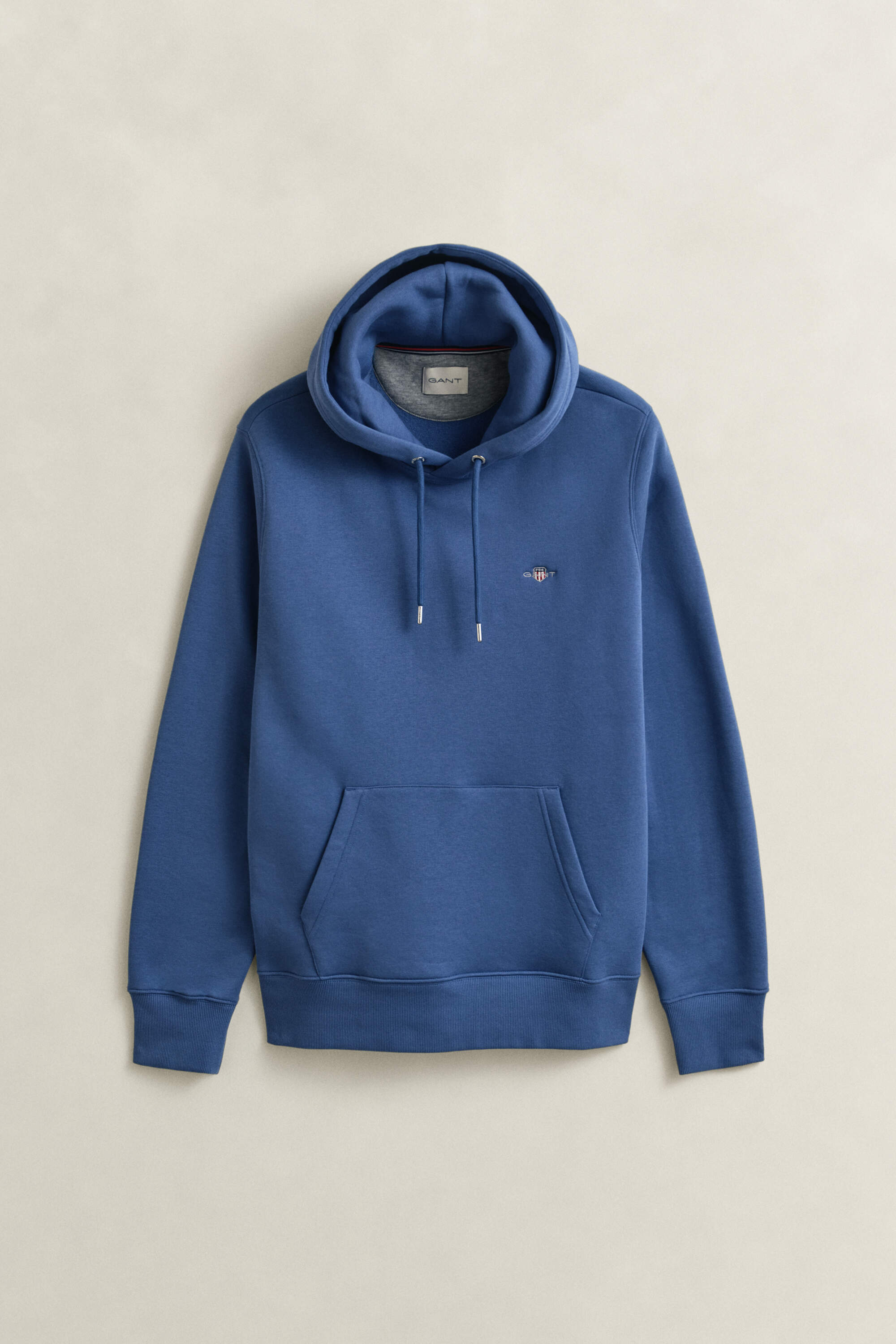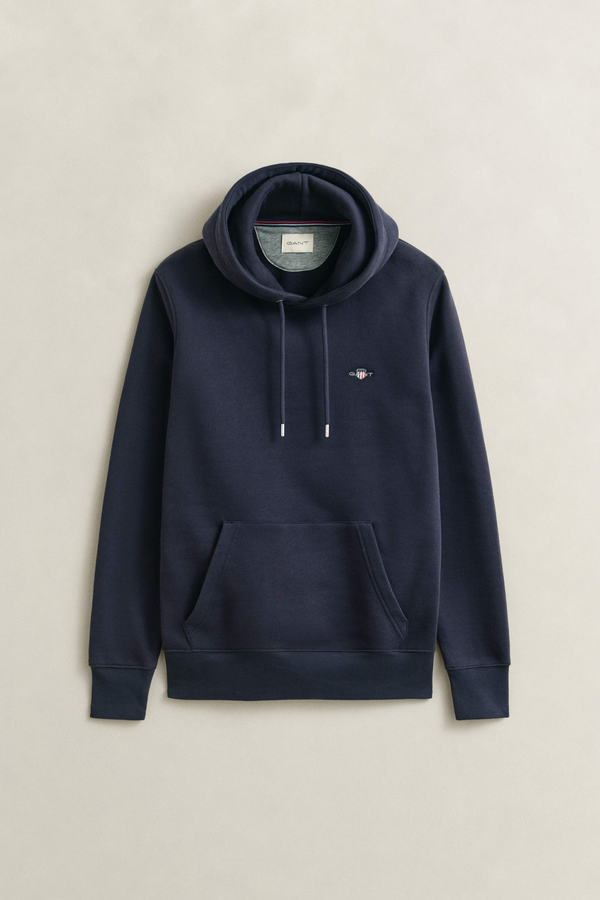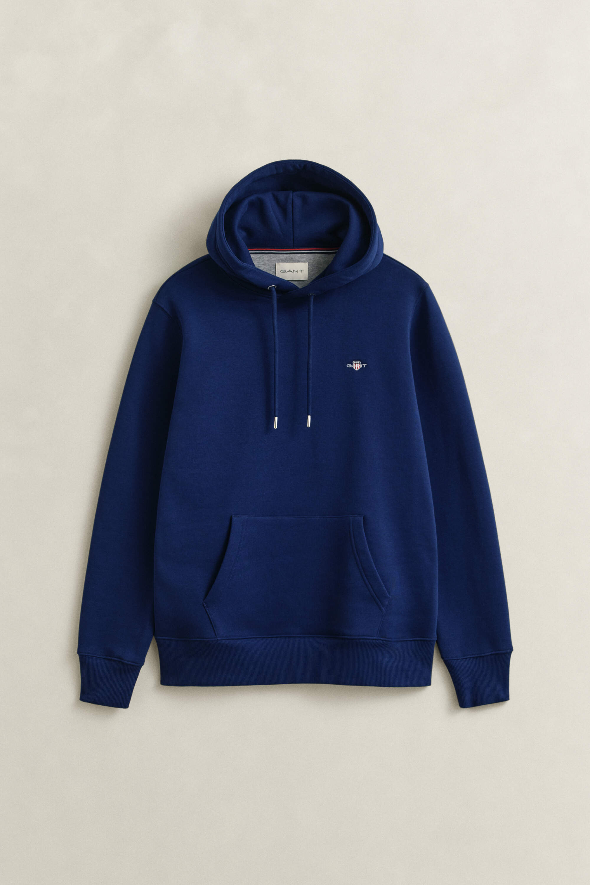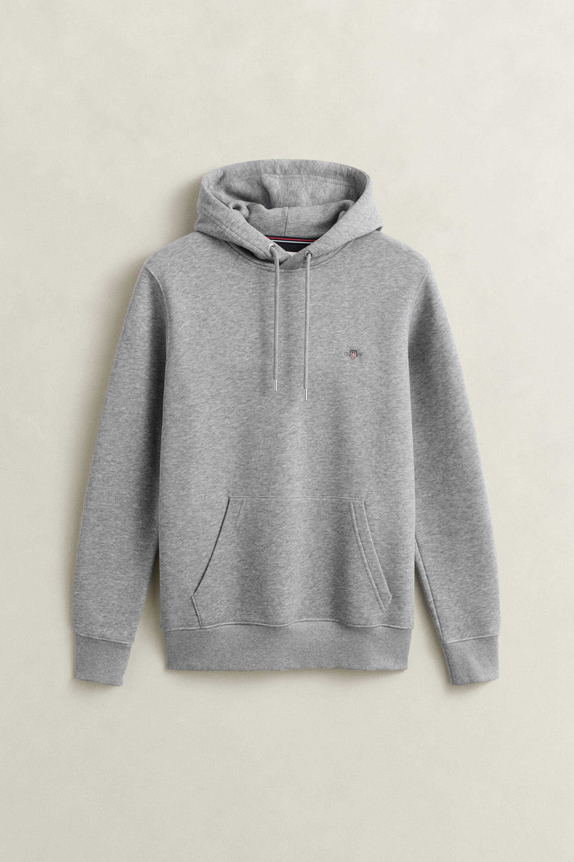 Dieser Gant Herren Hoodie im Regular Fit ist aus einem weichen Baumwoll-Polyester-Gemisch gefertigt. Das Design prägen eine Kapuze mit silberfarbenen Ösen am Kordelzug, eine Kängurutasche und eine kleine Gant-Wappenstickerei auf der Brust, die dezent auf die Marke hinweist.