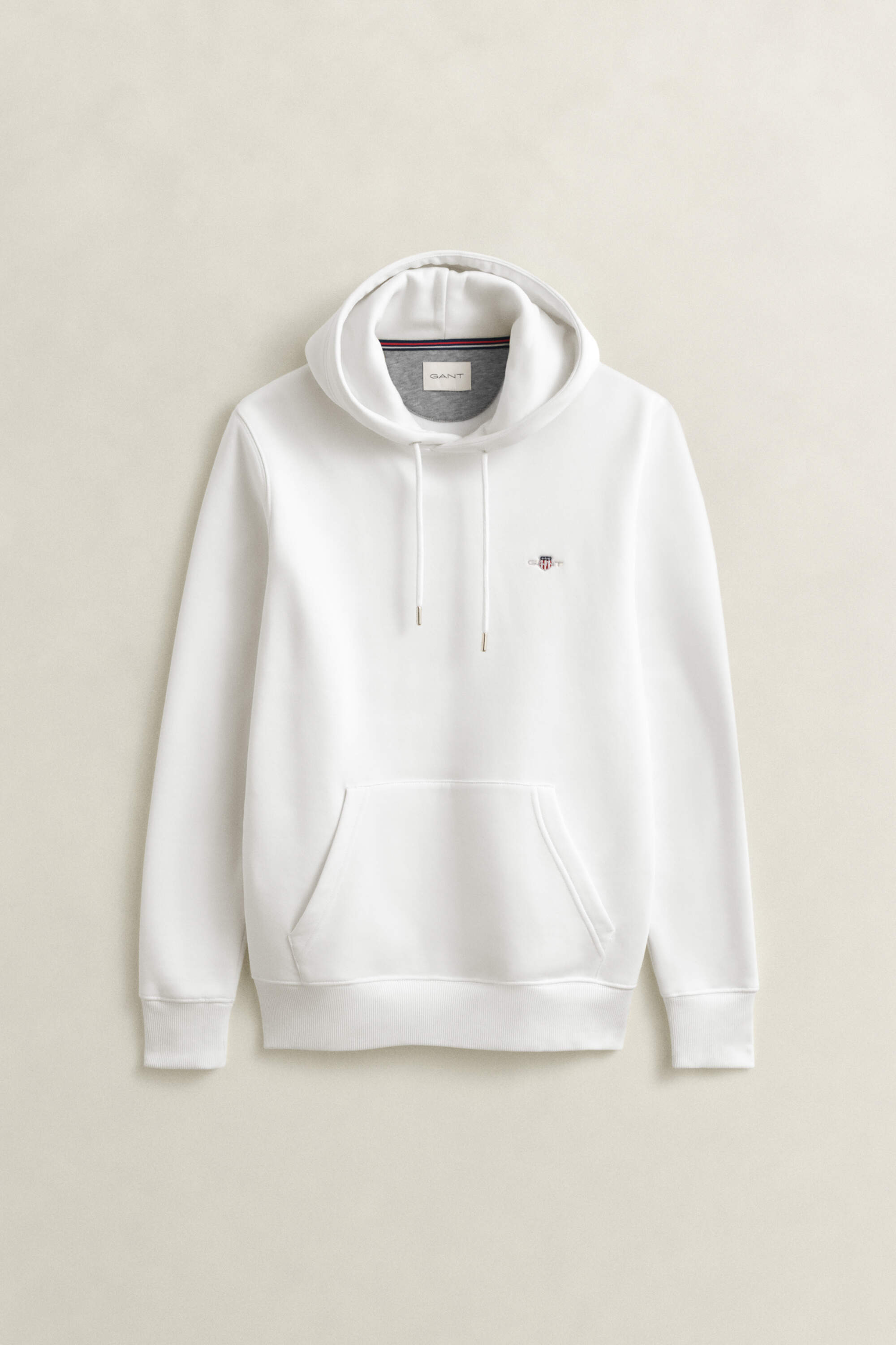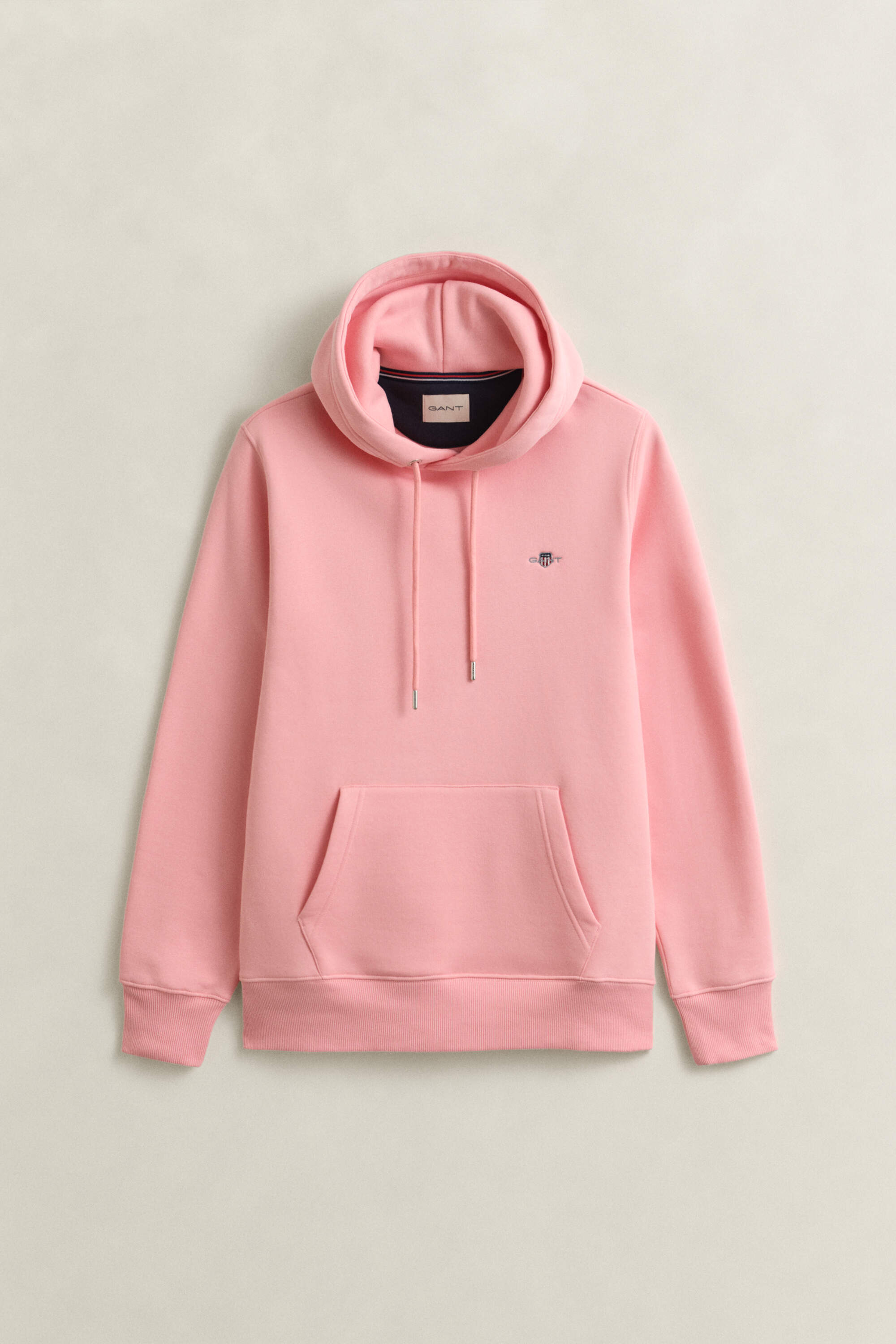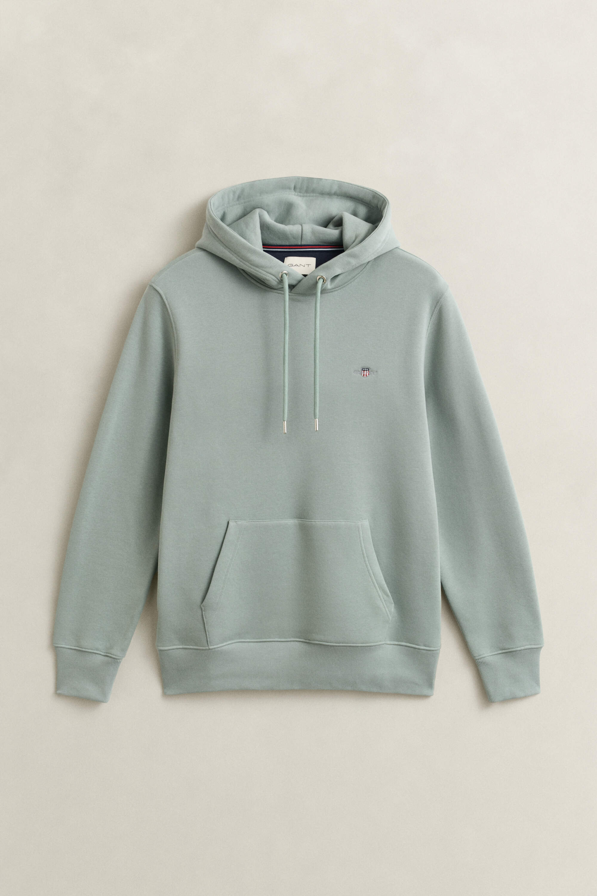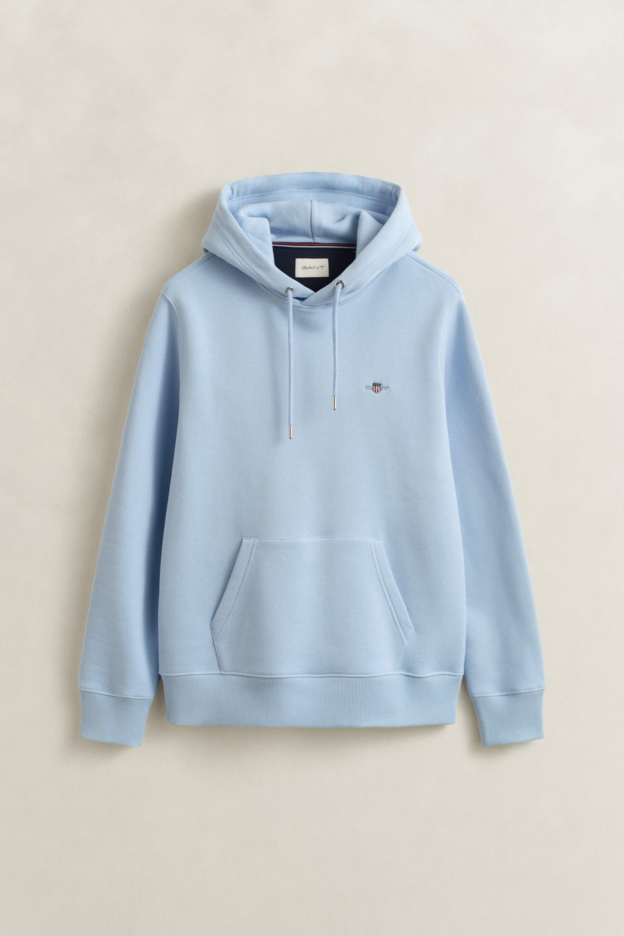 Dieser Gant Herren Hoodie im Regular Fit ist aus einem weichen Baumwoll-Polyester-Gemisch gefertigt. Das Design prägen eine Kapuze mit silberfarbenen Ösen am Kordelzug, eine Kängurutasche und eine kleine Gant-Wappenstickerei auf der Brust, die dezent auf die Marke hinweist.