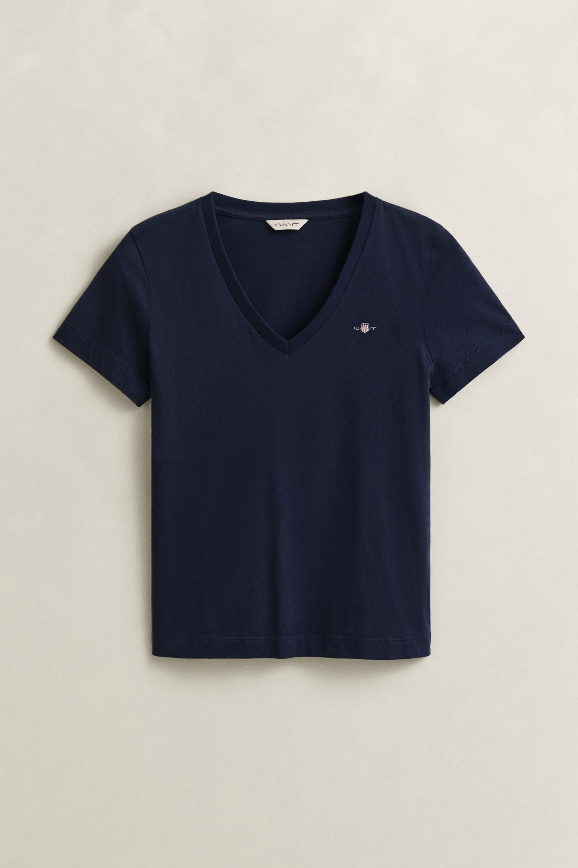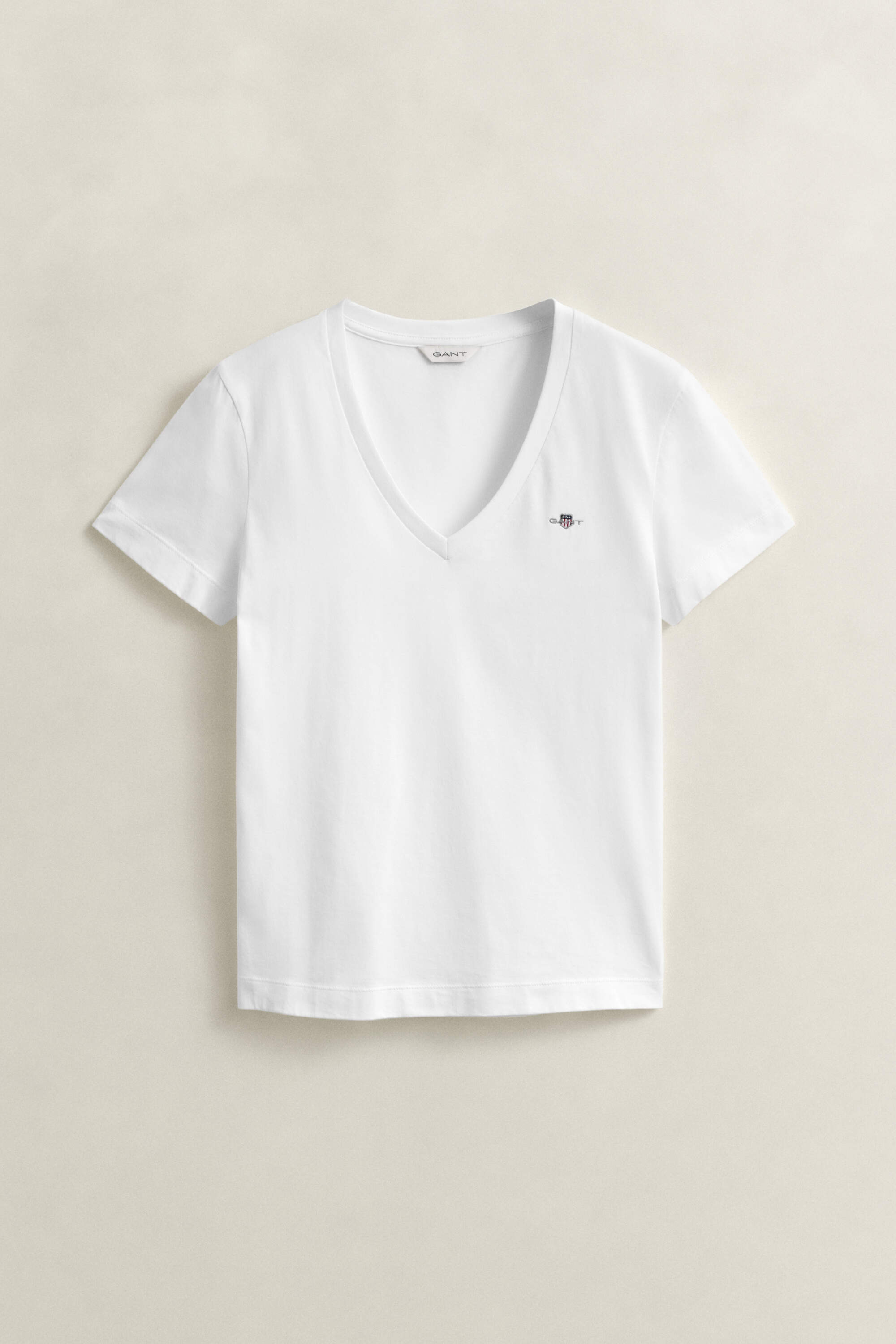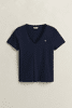 Dieses schlichte Gant Jersey-T-Shirt für Damen hat kurze Ärmel und einen klassischen V-Ausschnitt. Es ist aus weicher Baumwolle gefertigt. Veredelt wird das Design durch eine kleine, aufgestickte Gant Wappengrafik auf der Brust.