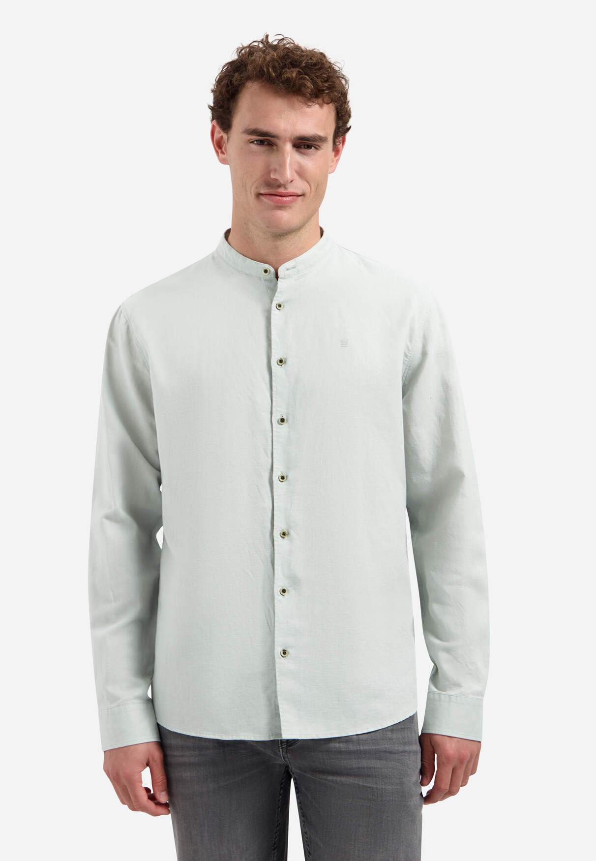 Dieses Langarmhemd hat einen Stehkragen und ist aus einer leichten Leinen-Baumwollmischung gefertigt. Es hat einen modernen, klaren Look und lässt sich leicht mit Chinos oder unter einer leichten Jacke kombinieren.