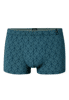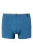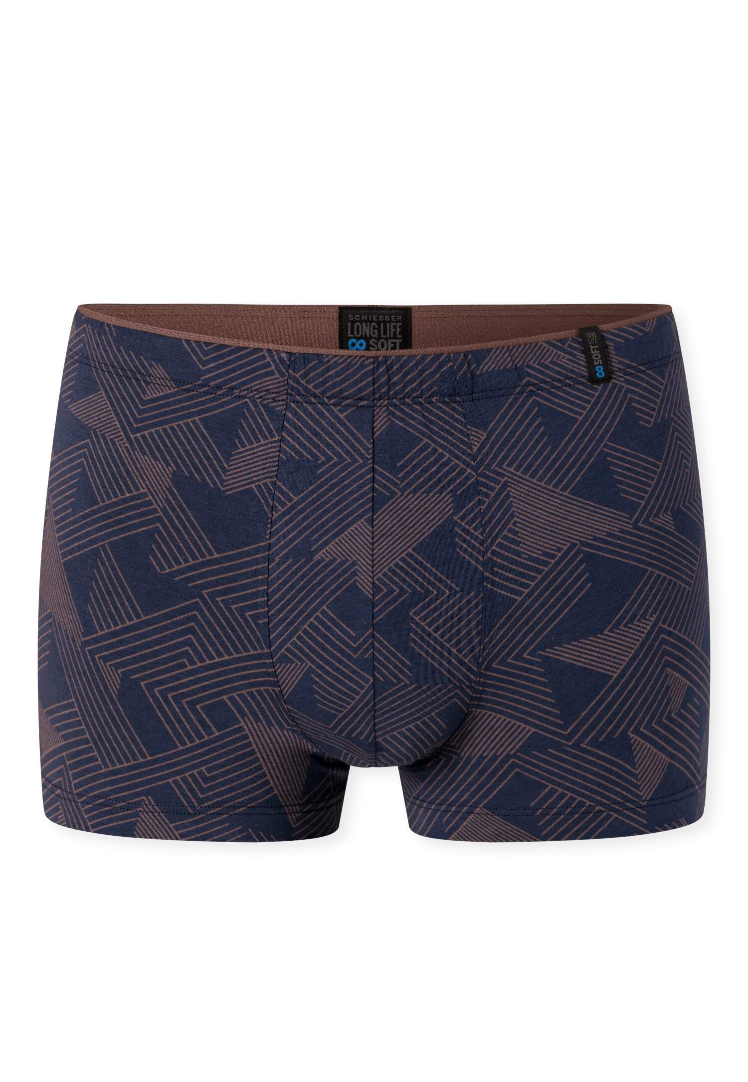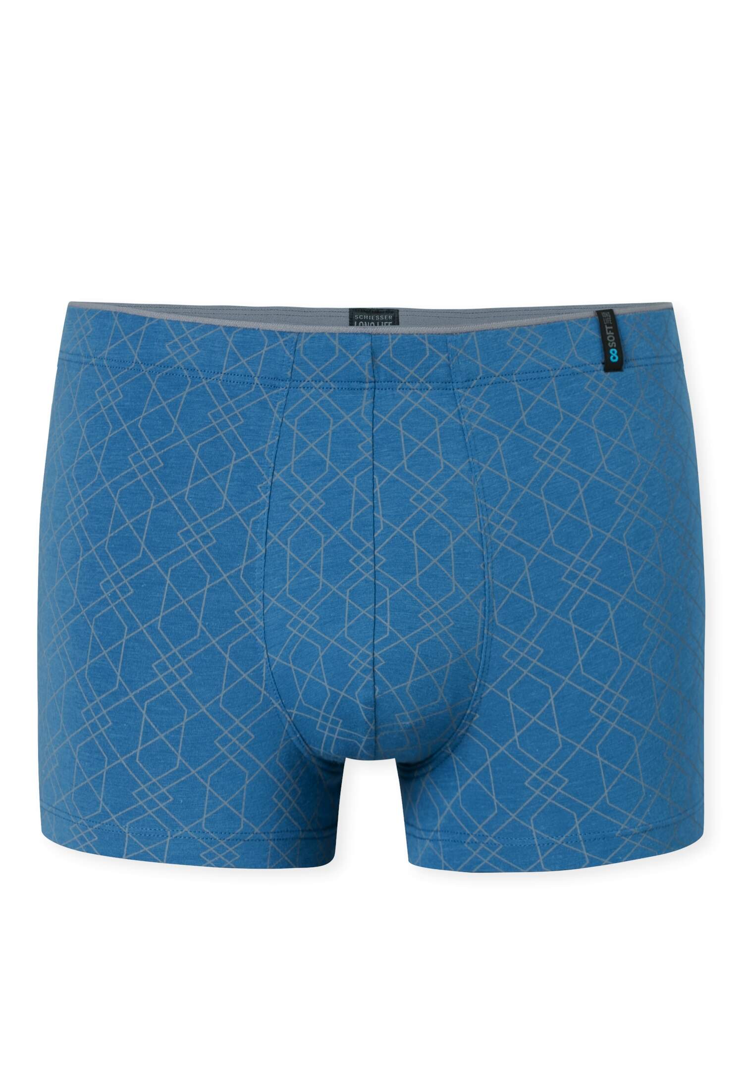blaue Herren-Shorts mit feinem, geometrischem Muster, aus der SCHIESSER Serie 'Long Life Soft', optimales Feuchtigkeitsmanagement dank ausgeglichenem Micromodal-Anteil, reduzierte Pilling-Bildung und glatte, gleichmäßige Oberfläche mit natürlichem Glanz, perfekte Passform und Formstabilität dank 10 % Elasthan, unsere Models tragen Größe 5/M, in hochwertiger, elastischer Single-Jersey-Qualität