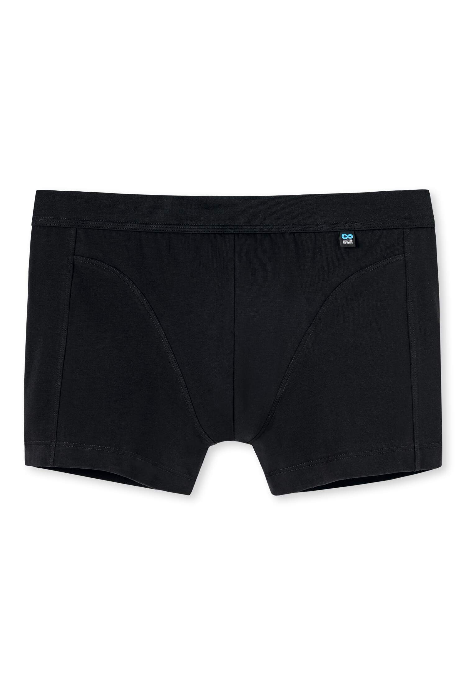 schwarze, körpernahe Herrenshorts, aus der SCHIESSER-Serie 'Long Life Cotton', höchste Qualität und Langlebigkeit auch nach vielen Wäschen durch einzigartige Verarbeitung, komfortabler Bund mit kleinem Serien-Logo, OEKO-TEX® MADE IN GREEN (M24LGZ1U5 Hohenstein HTTI), reduzierte Pilling-Bildung und glatte und gleichmäßige Oberfläche, in perfekt sitzender, elastischer Single-Jersey-Qualität