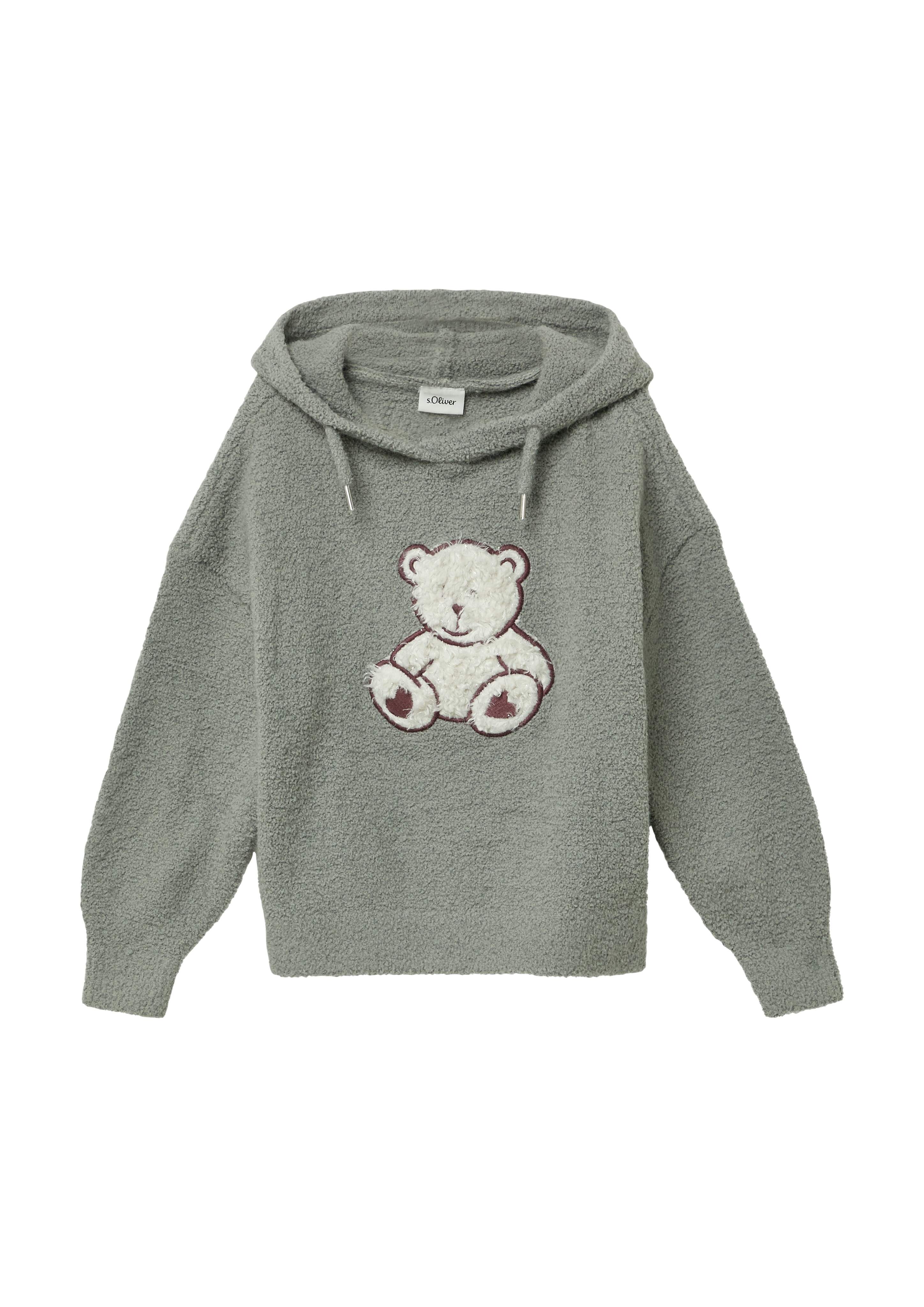 Kuscheliger Strickpullover aus weichem Teddy-Plüsch mit niedlicher Front-Applikation. Die fixierte Kapuze mit Tunnelzug und die überschnittenen Schultern im Loose Fit bieten maximalen Komfort. Rippbündchen an Ärmeln und Saum sorgen für perfekten Sitz.