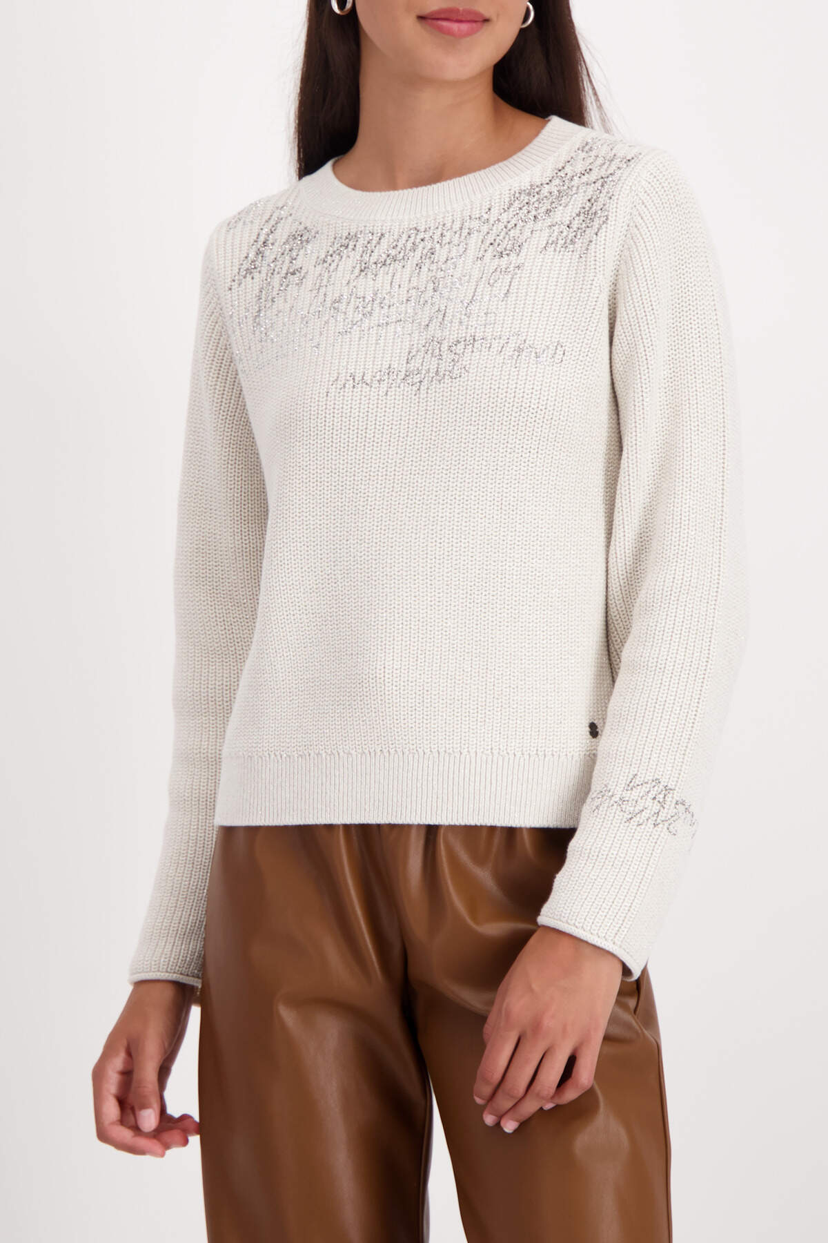 Eleganter Strickpullover aus einer hochwertigen Baumwollmischung, verziert mit glänzendem Lurex, Strasssteinen und einem stilvollen Schriftmuster.