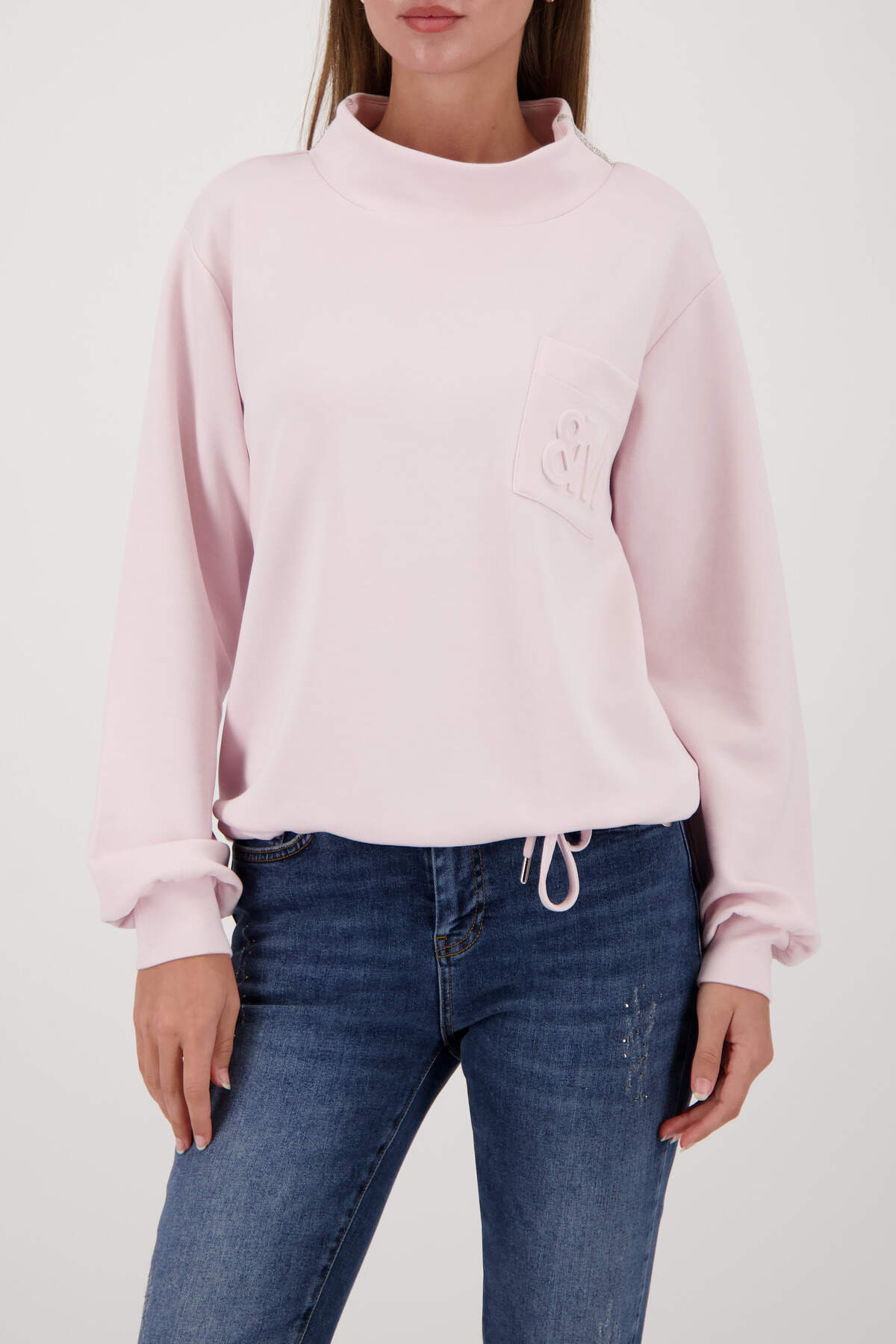 Dieses einzigartige Sweatshirt besticht durch seinen auffälligen 3D-Druck auf der Brusttasche und den eleganten Schmuck am Stehkragen.
