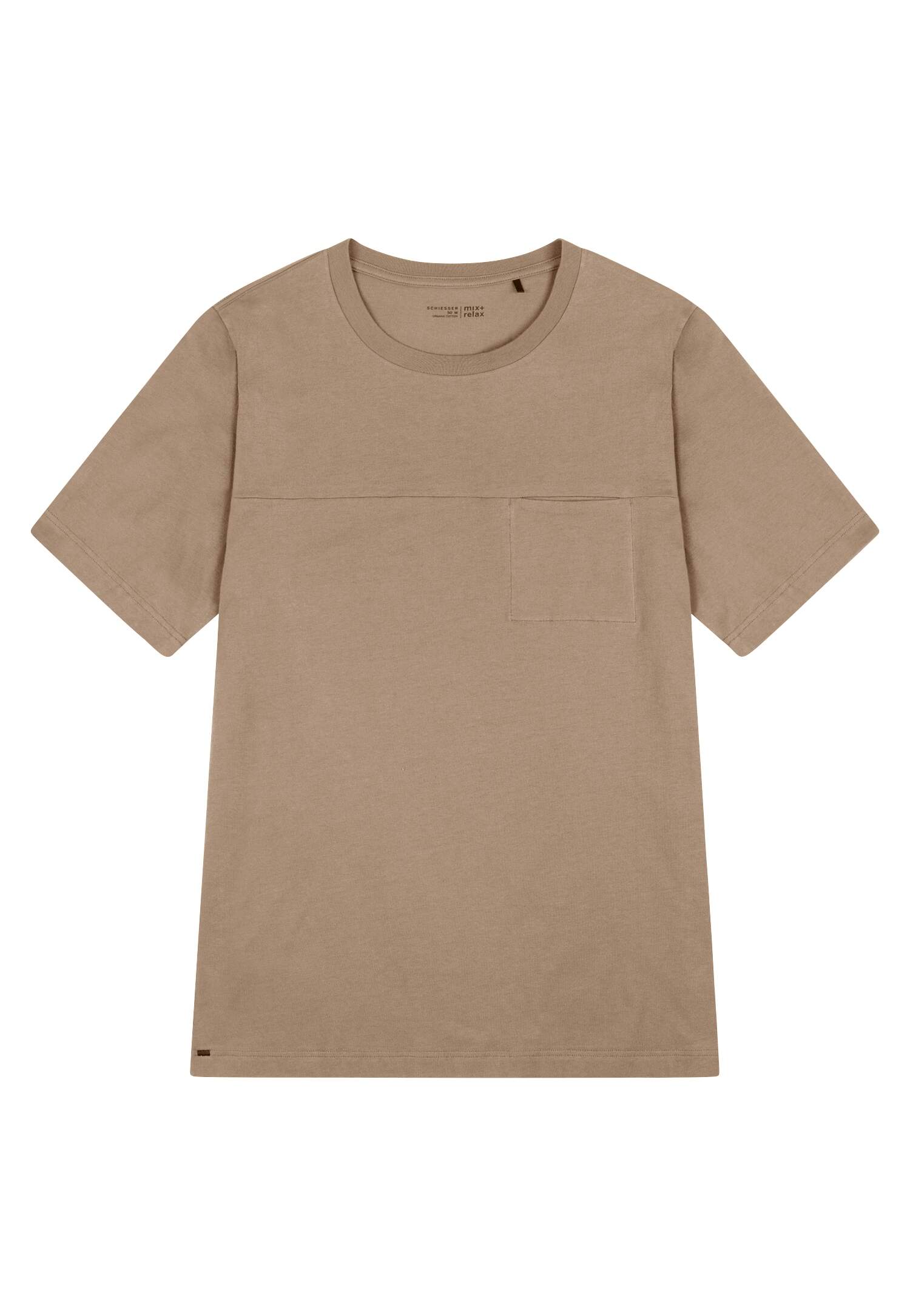 Kurzarmshirt für Herren in der Farbe Nougat, aus der beliebten SCHIESSER Serie 'Mix+Relax', moderne, lässige Passform, mit geripptem Rundhalsausschnitt, Ziernaht in Brusthöhe mit eingelassener Brusttasche, unsere Models tragen Größe 50/M, hochwertiges Material in feiner Sweat-Qualität