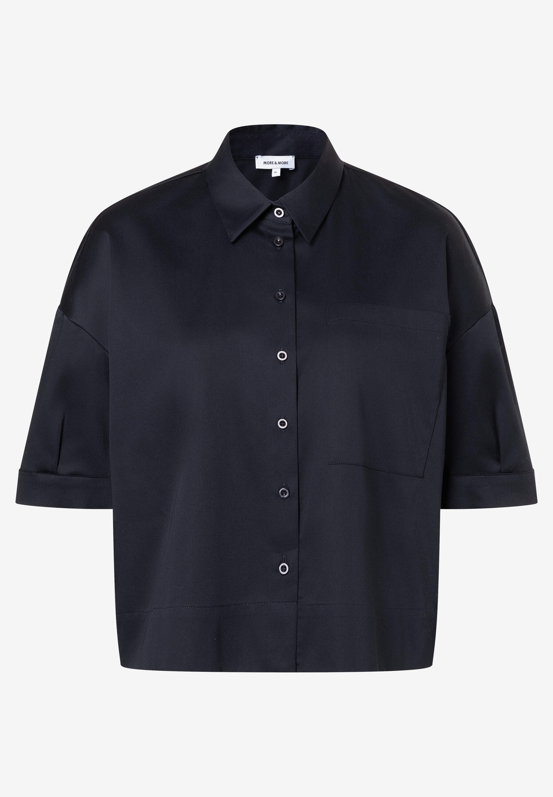 Die verkürzte, hochgeschlossene Hemdbluse von MORE & MORE in angesagtem Boxy Shape verkörpert den perfekten Mix aus klassisch und trendy. Der weite, kastige Schnitt bietet einen angenehmen Tragekomfort und verleiht der Bluse zugleich einen coolen, lässigen Touch - perfekt für alle, die einen cleanen, modernen Look lieben.