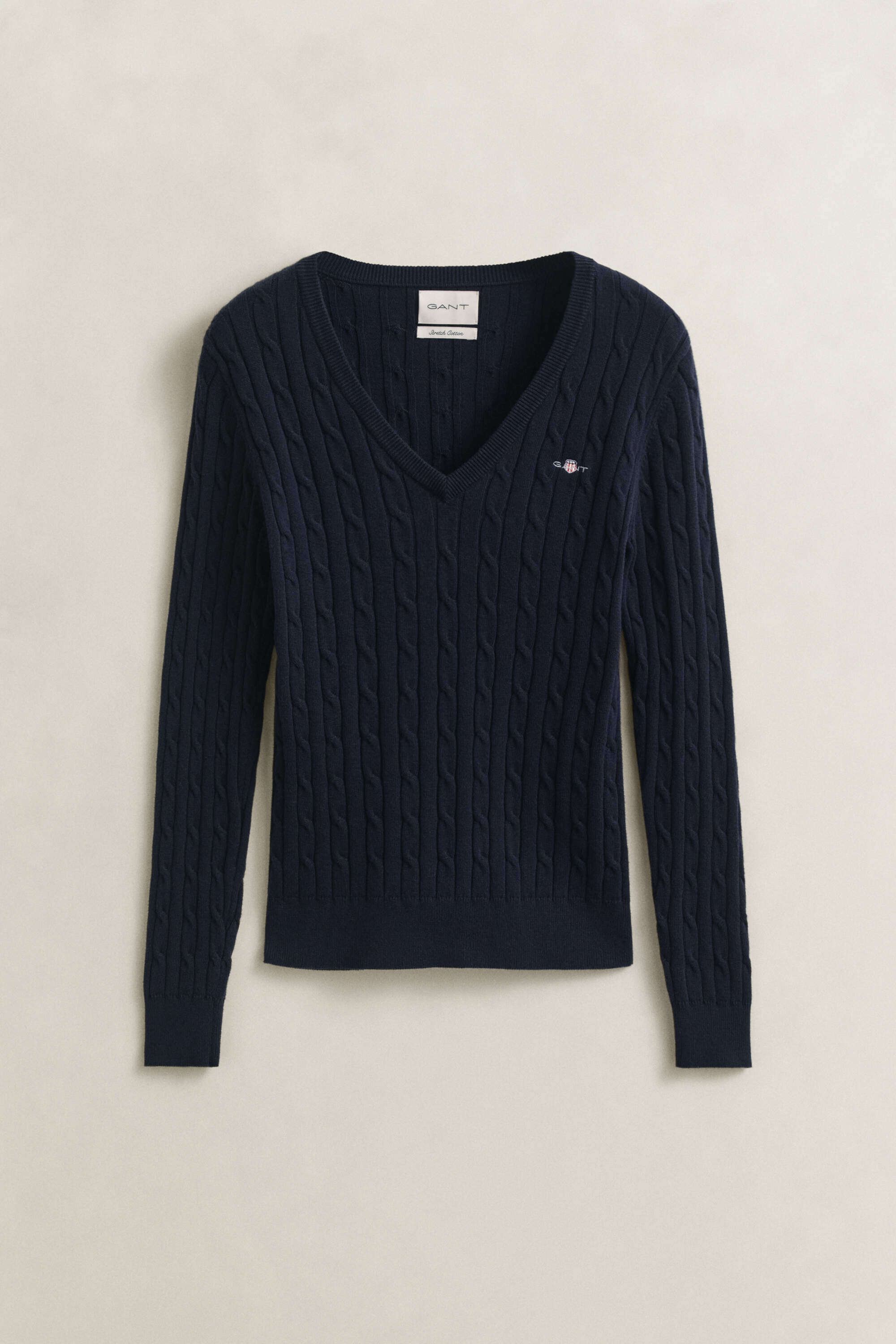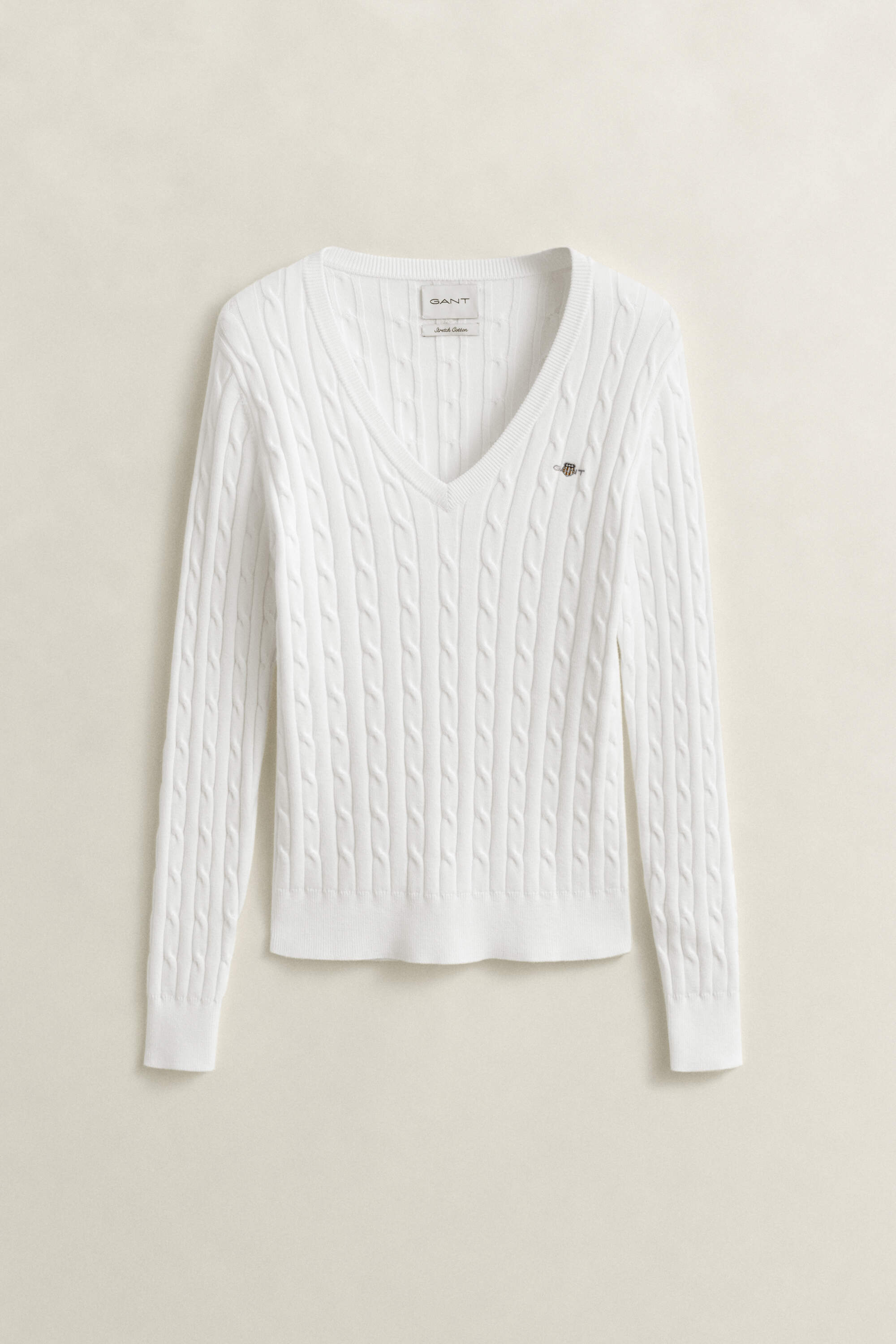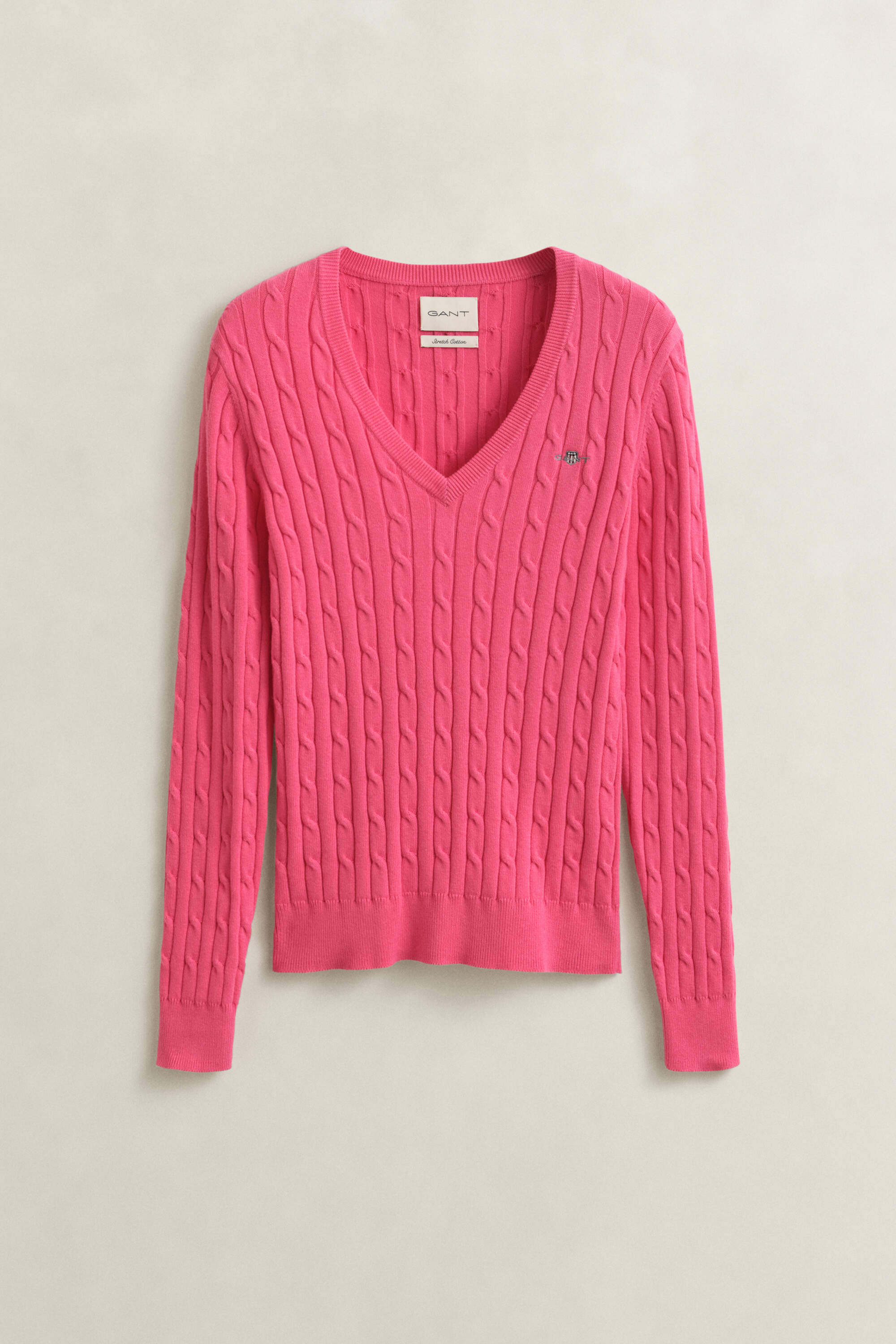 Dieser Pullover mit V-Ausschnitt für Damen ist ein echter GANT Klassiker und zeigt sich mit einem Zopfstrickmuster. Er ist aus einer weichen Baumwoll-Elastan-Mischung gefertigt und im dehnbaren Slim Fit geschnitten. Die Brust schmückt eine aufgestickte GANT-Grafik, Ausschnitt, Saum und Ärmelenden sind gerippt. Sie können diesen vielseitigen Pullover mit allem kombinieren, ob mit Jeans, formellen Hosen, Röcken oder Shorts.