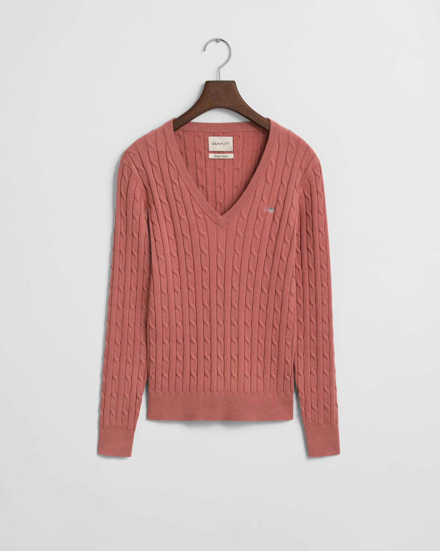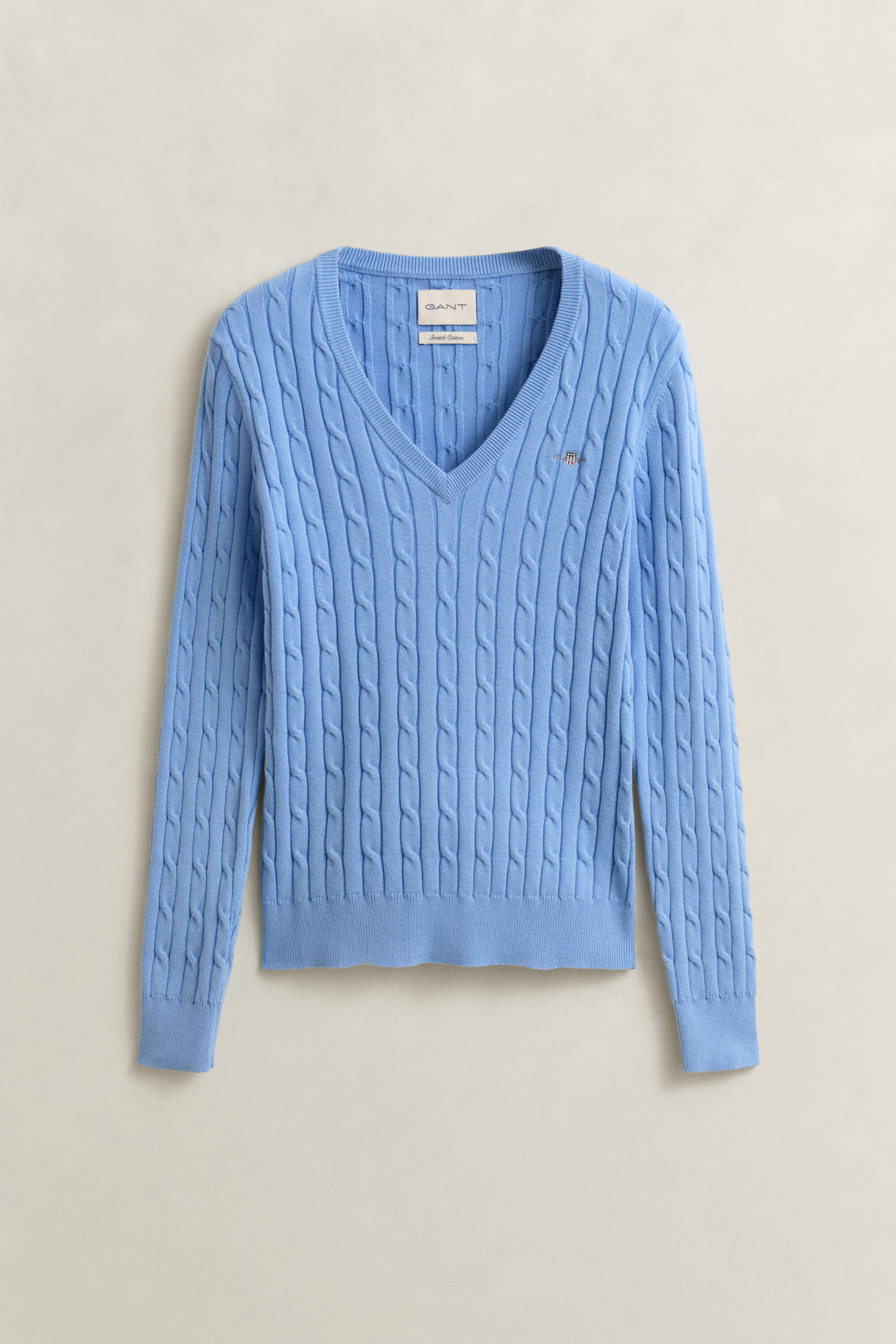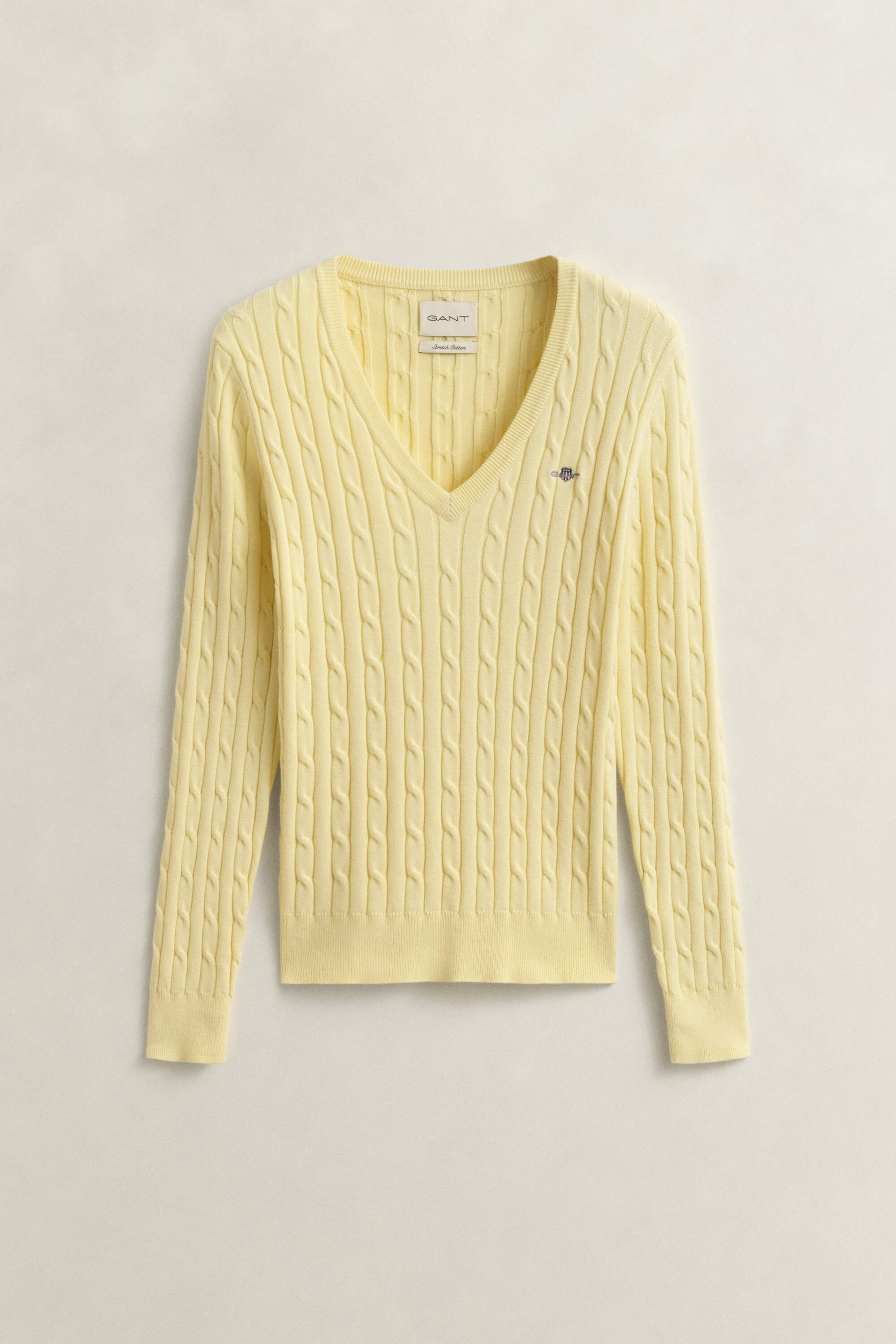 Dieser Pullover mit V-Ausschnitt für Damen ist ein echter GANT Klassiker und zeigt sich mit einem Zopfstrickmuster. Er ist aus einer weichen Baumwoll-Elastan-Mischung gefertigt und im dehnbaren Slim Fit geschnitten. Die Brust schmückt eine aufgestickte GANT-Grafik, Ausschnitt, Saum und Ärmelenden sind gerippt. Sie können diesen vielseitigen Pullover mit allem kombinieren, ob mit Jeans, formellen Hosen, Röcken oder Shorts.