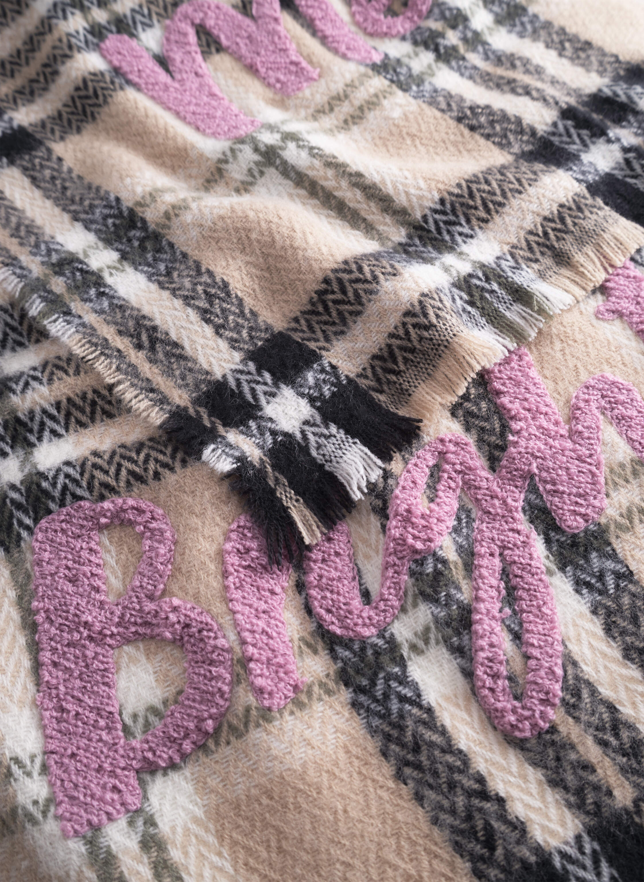Schal aus softem Acryl mit Karogrund und BRIGHT-Stickerei